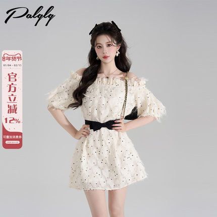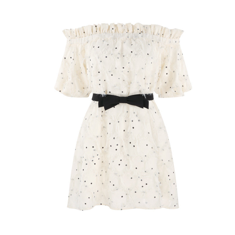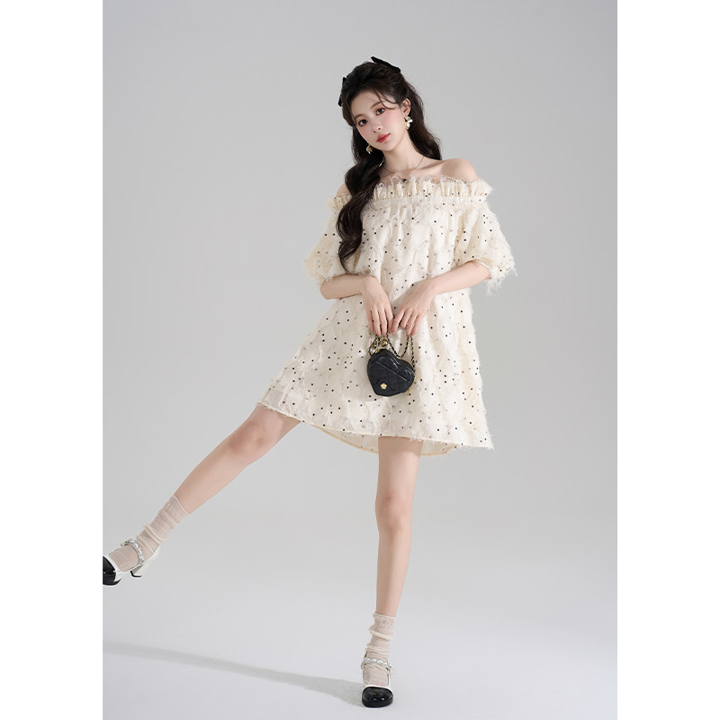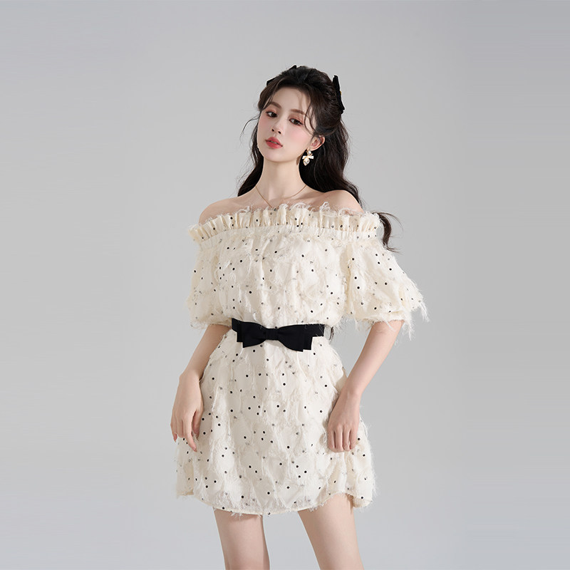 法式流苏波点一字肩连衣裙女夏季小香风甜美富家千金收腰a字裙子