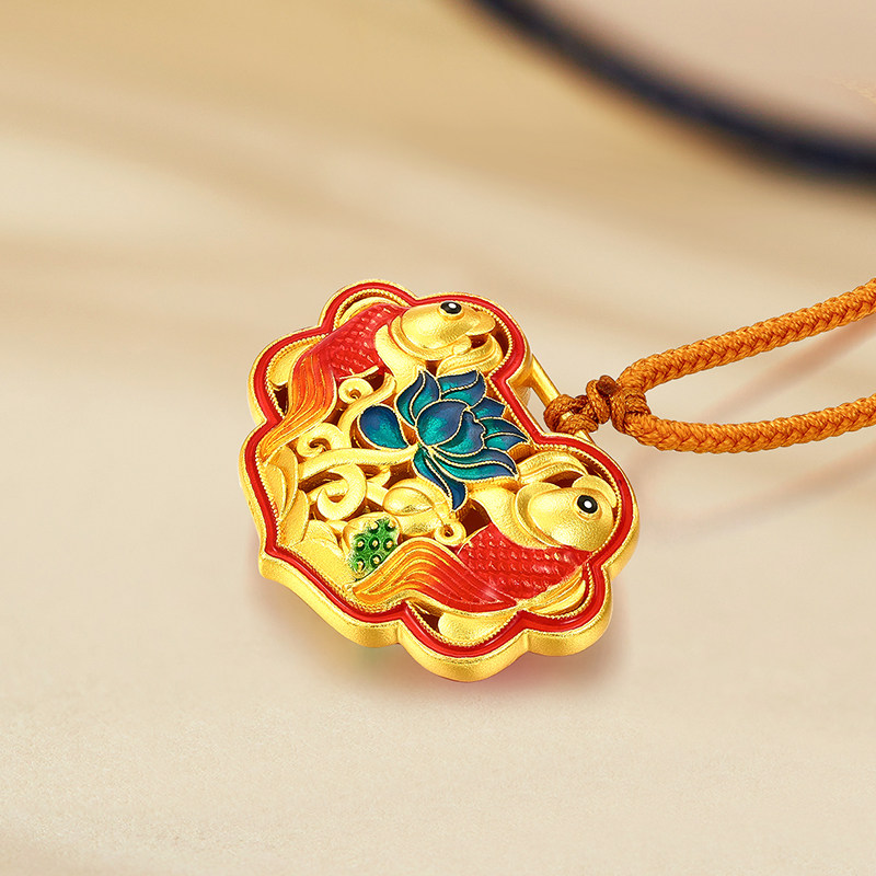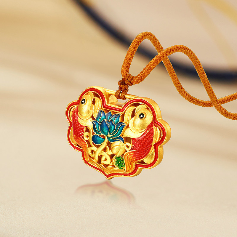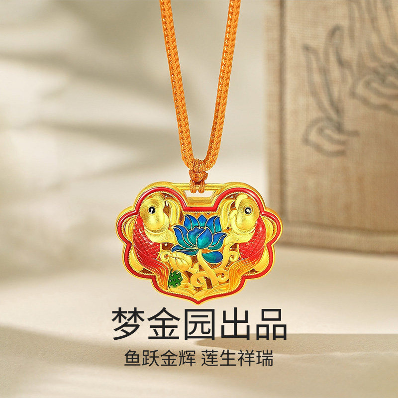 梦金园宫廷古法银系列锦鲤莲花长命锁吊坠足银锁包挂坠国潮风