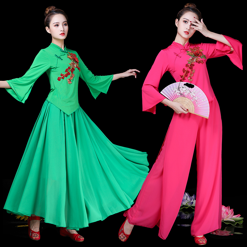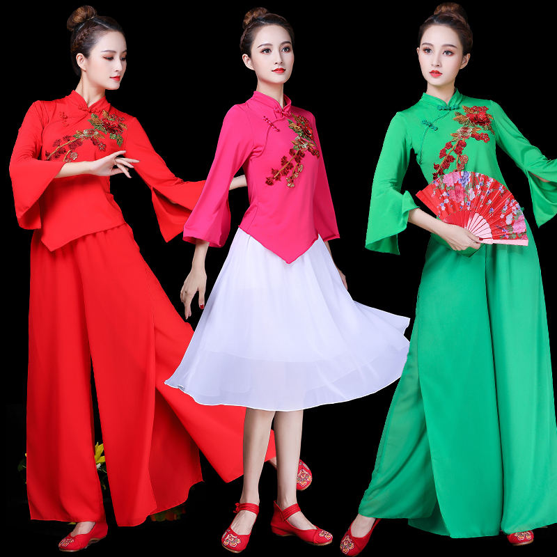 广场舞服装时尚秧歌队服套装长裙大红色接新娘扇子舞蹈服2025新款