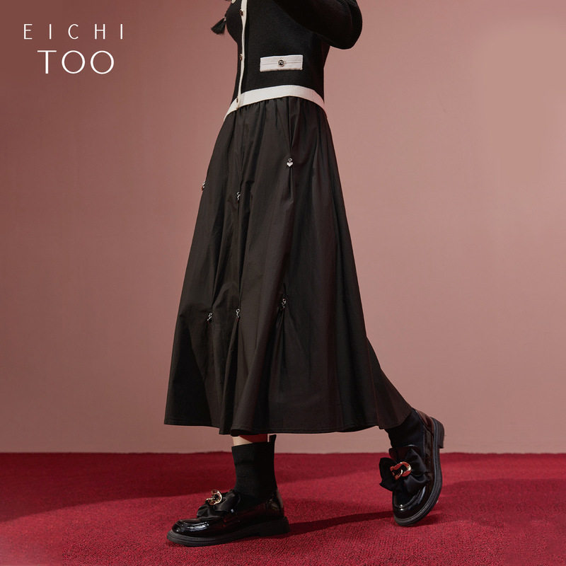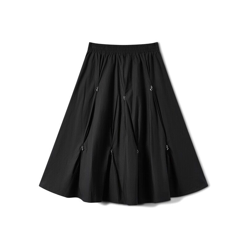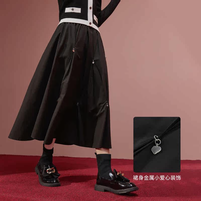 爱居兔春季新款半身裙宽松廓型纯棉爱心金属装饰黑色长裙