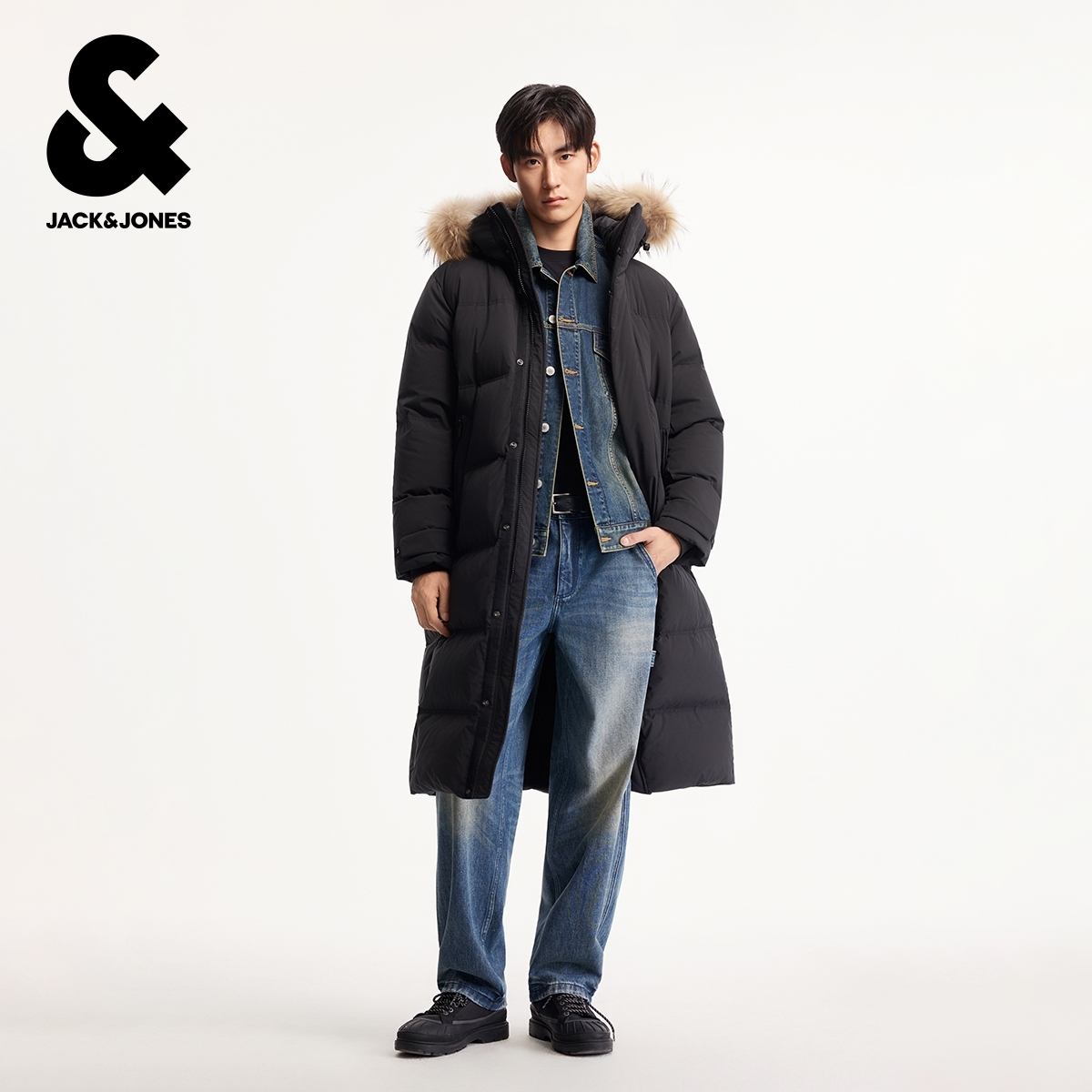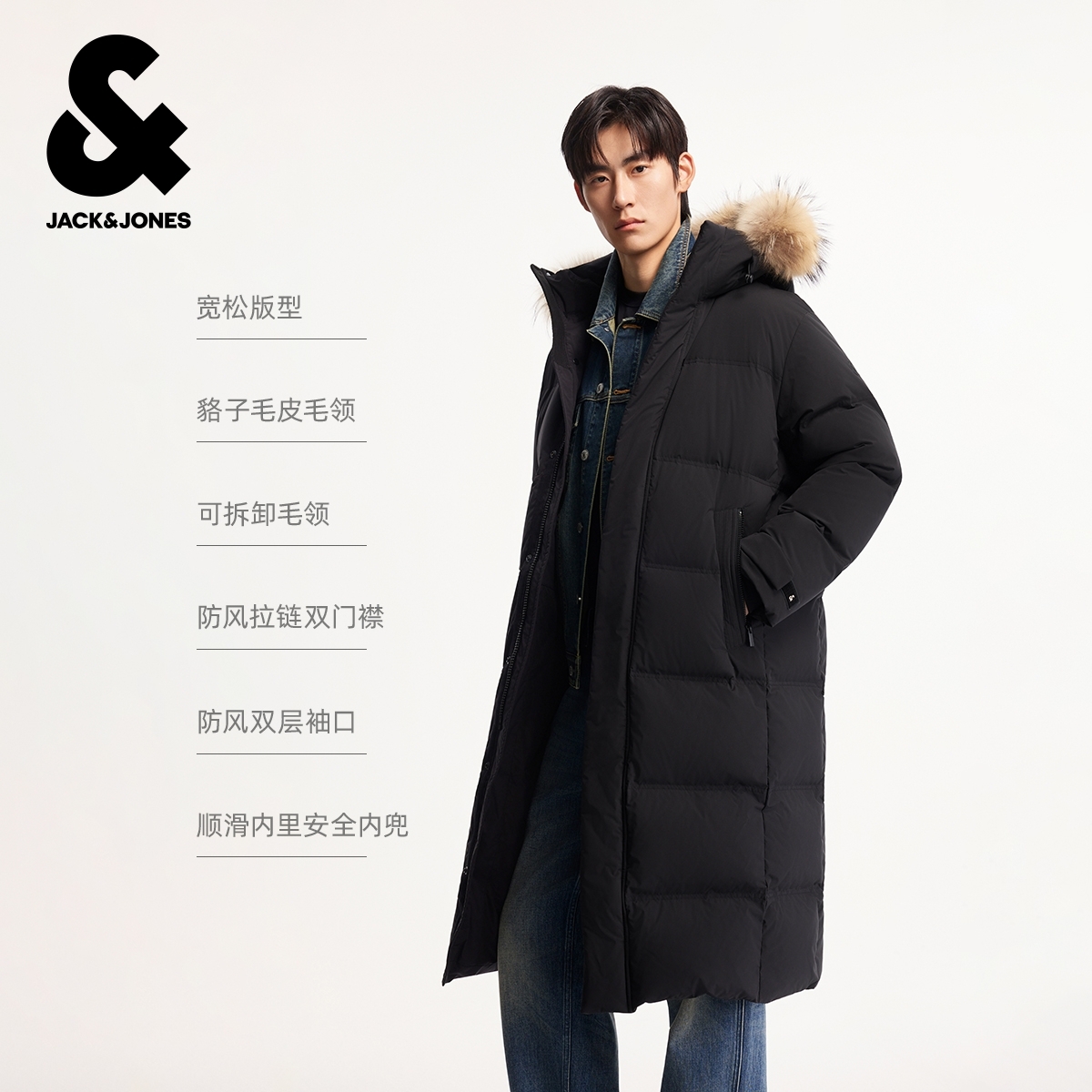 绫致杰克琼斯男装冬羽绒服中长款连帽可拆毛领纯色通勤百搭外套