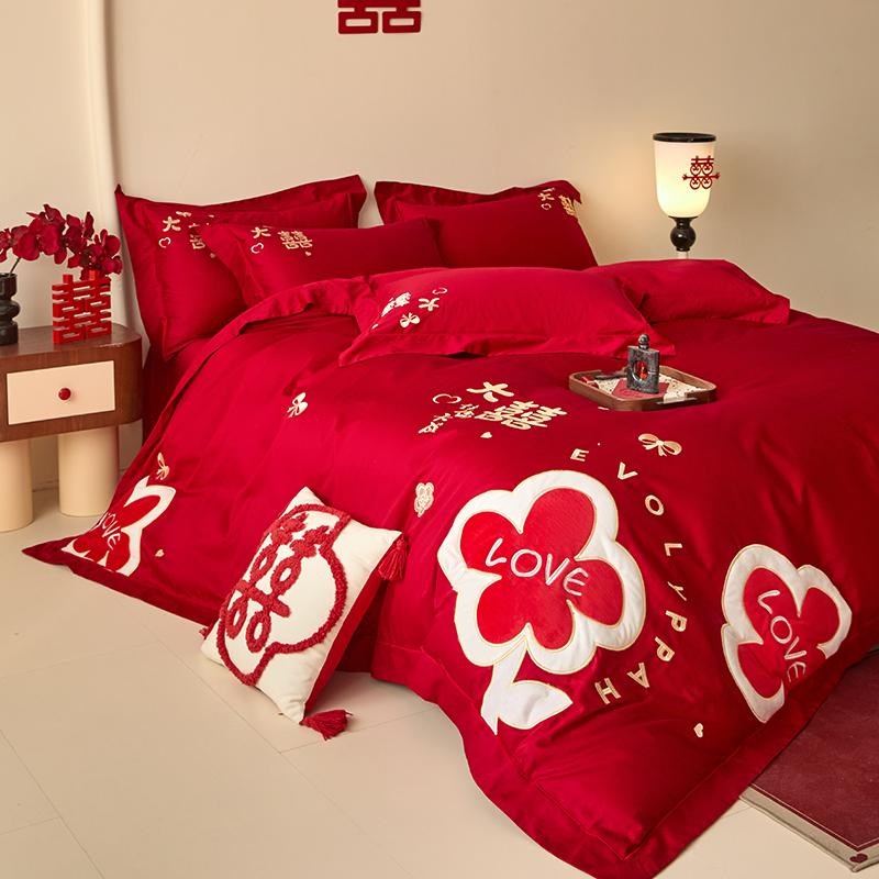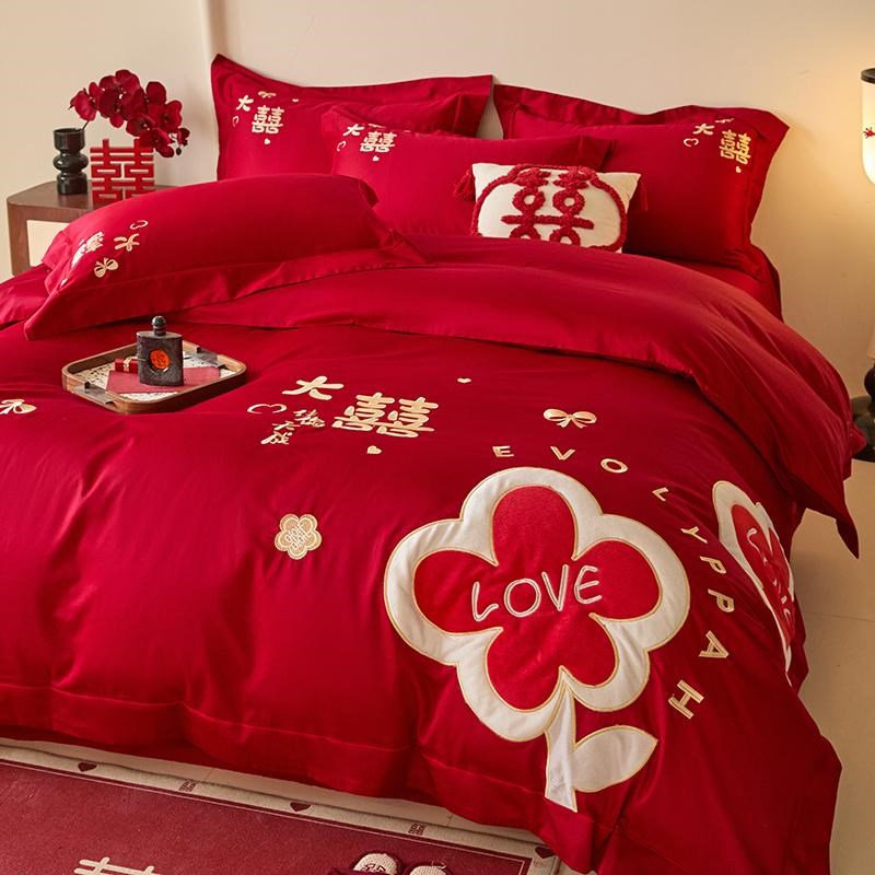 现代风时尚全棉结婚庆四件套红色喜结婚被套婚嫁婚房备婚床上用品