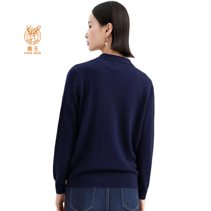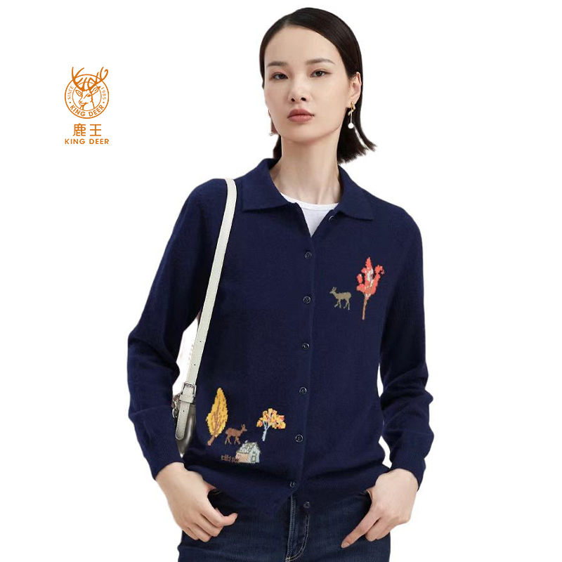 鹿王羊绒开衫女T恤领提花单排扣 春秋季针织保暖休闲蓝色毛衣外套