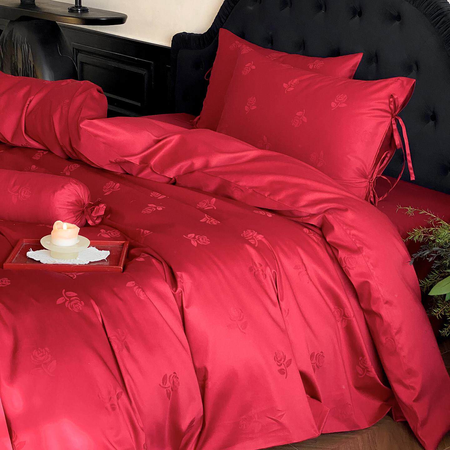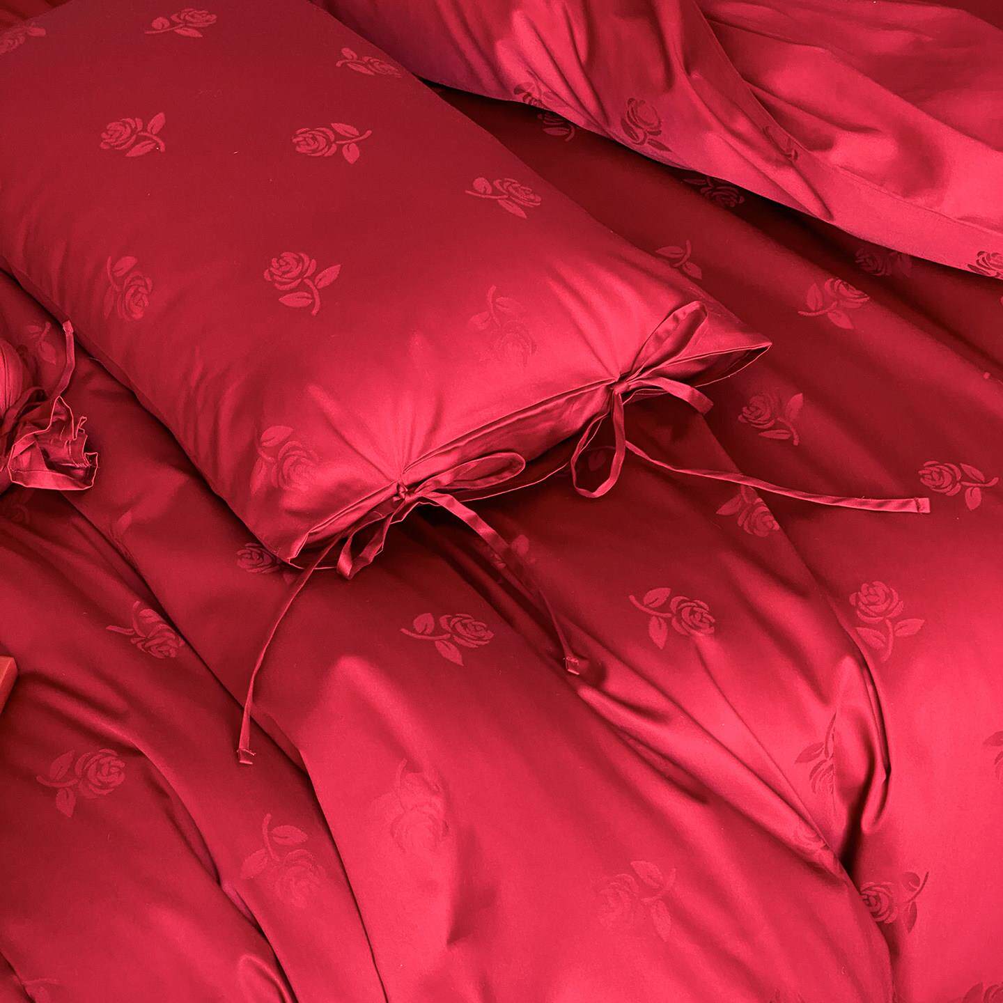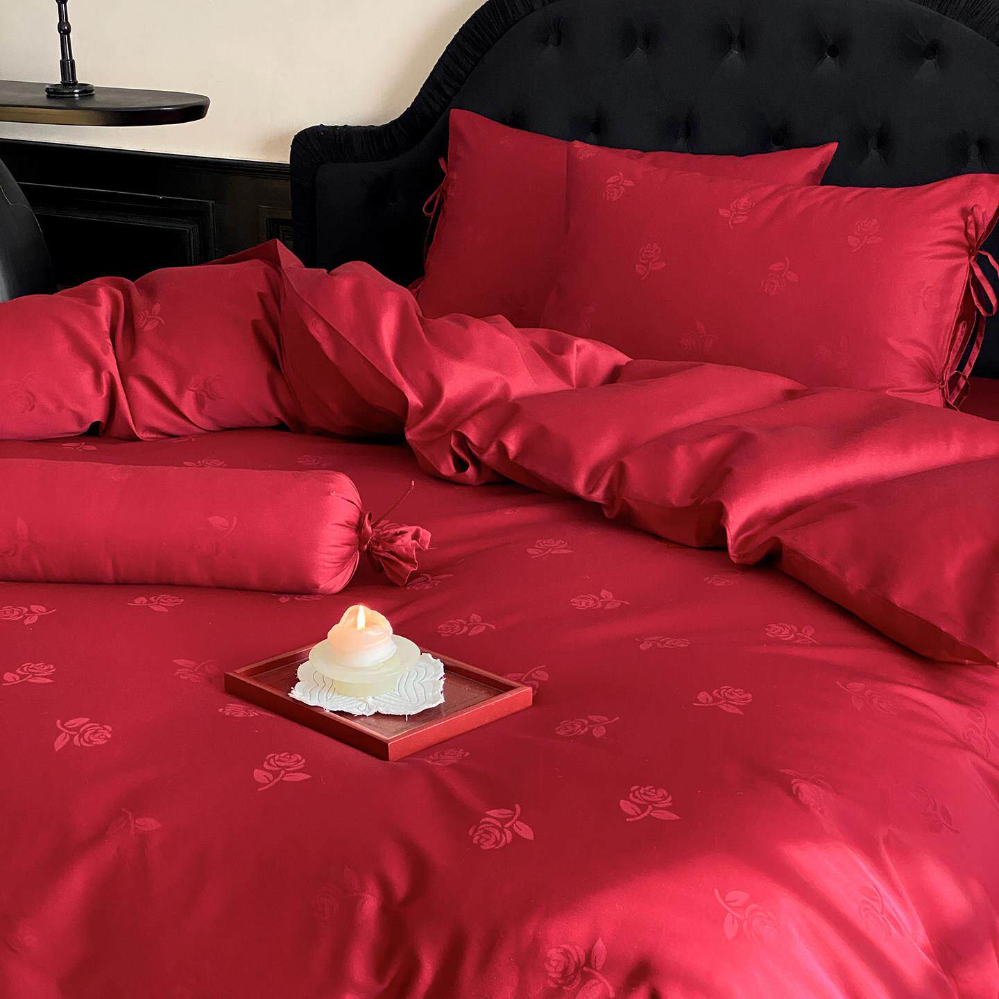 LANSWAY玫瑰提花全棉婚庆四件套长绒棉红色结婚陪嫁被套床单床笠