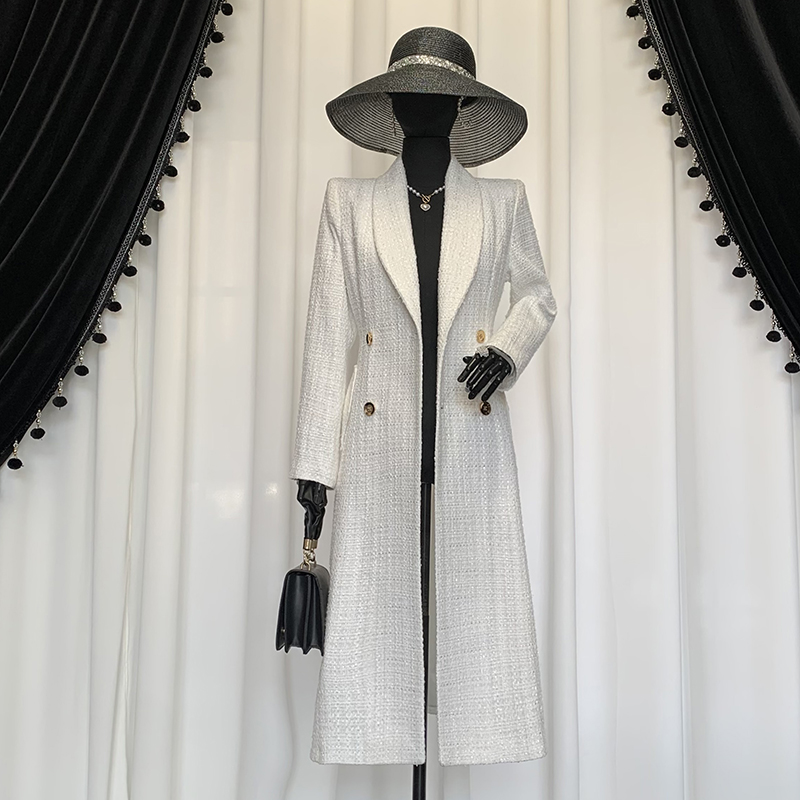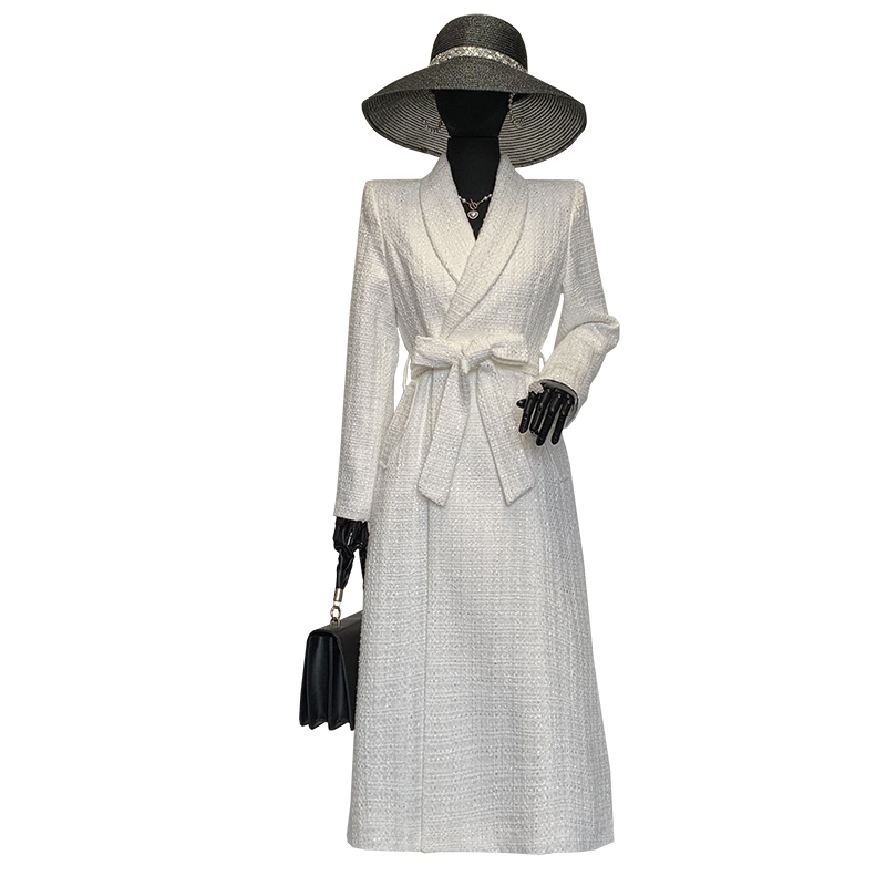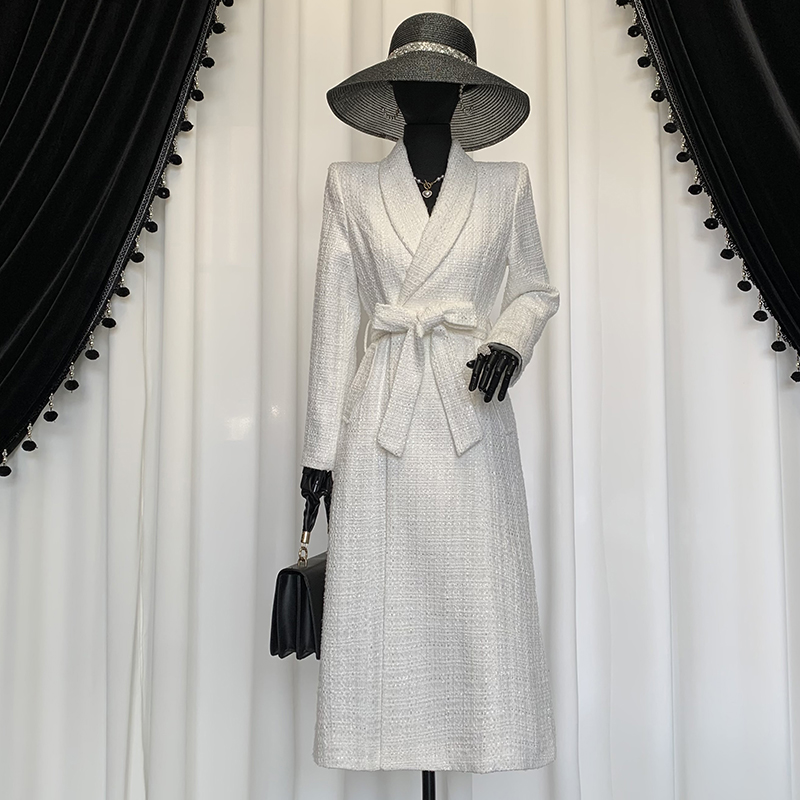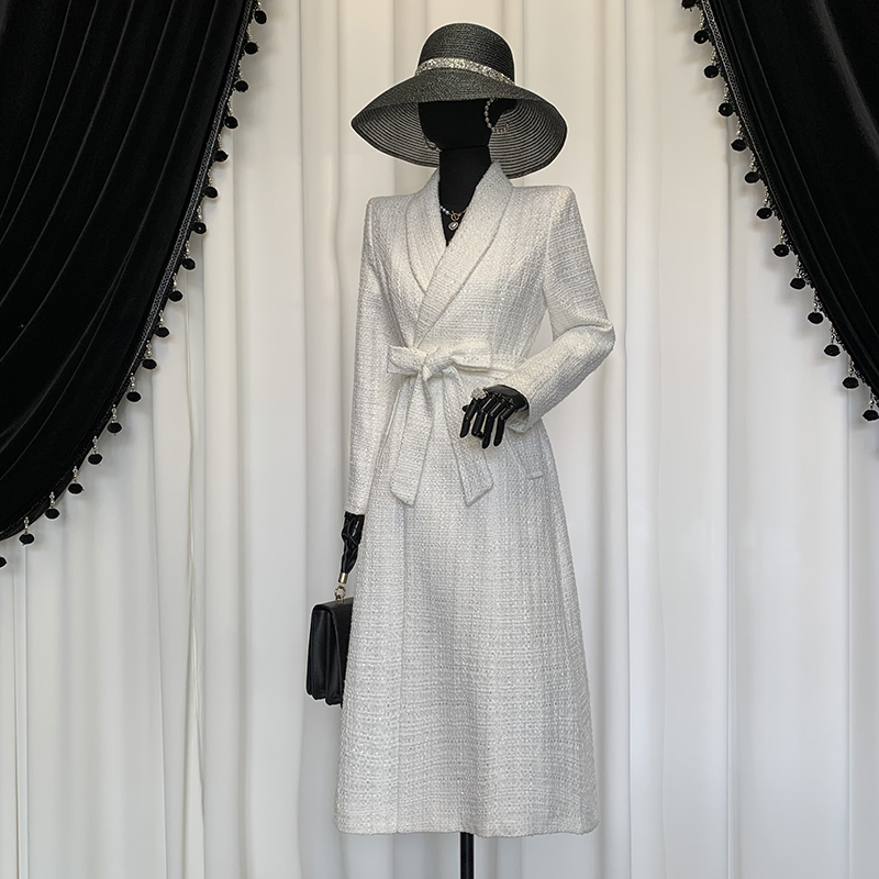 品诺狐2025春秋新品韩版长袖系带收腰显瘦风衣重工金线白色外套女