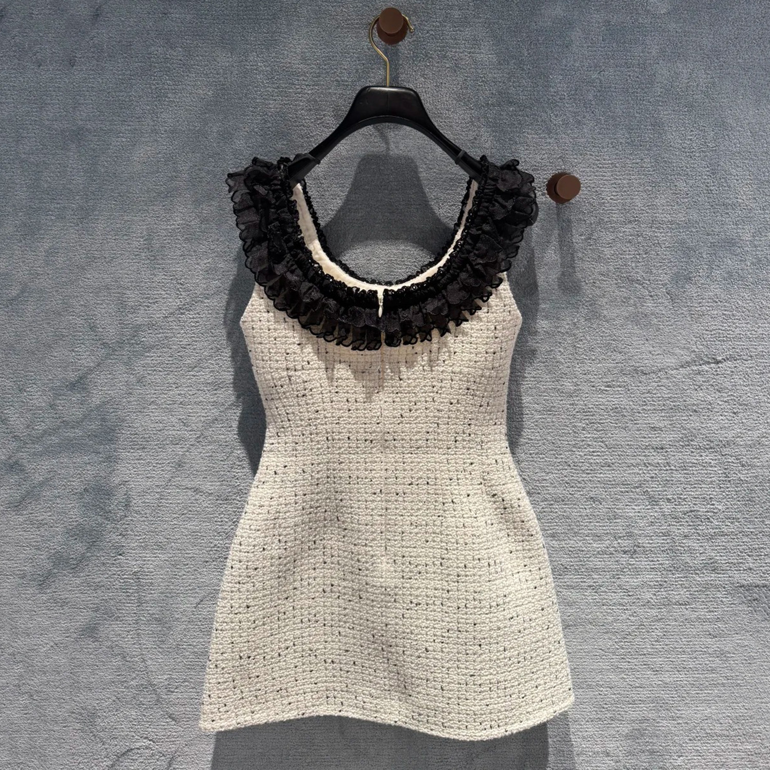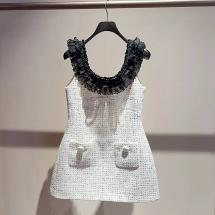 深圳南油高端女装2025冬新款时尚粗花呢欧根纱拼接绣花珠饰连衣裙