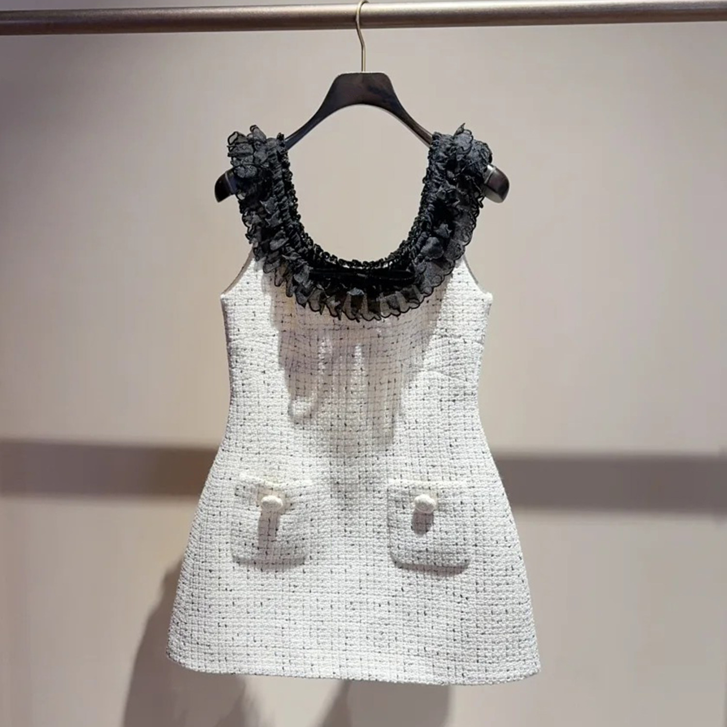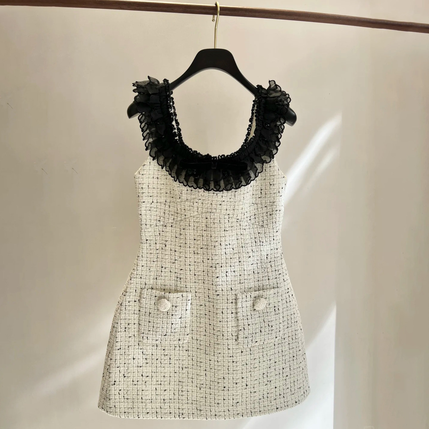 粗花呢欧根纱拼接绣花珠饰连衣裙
