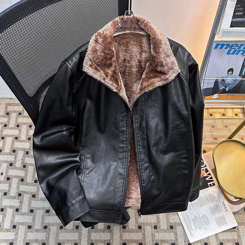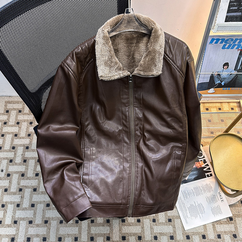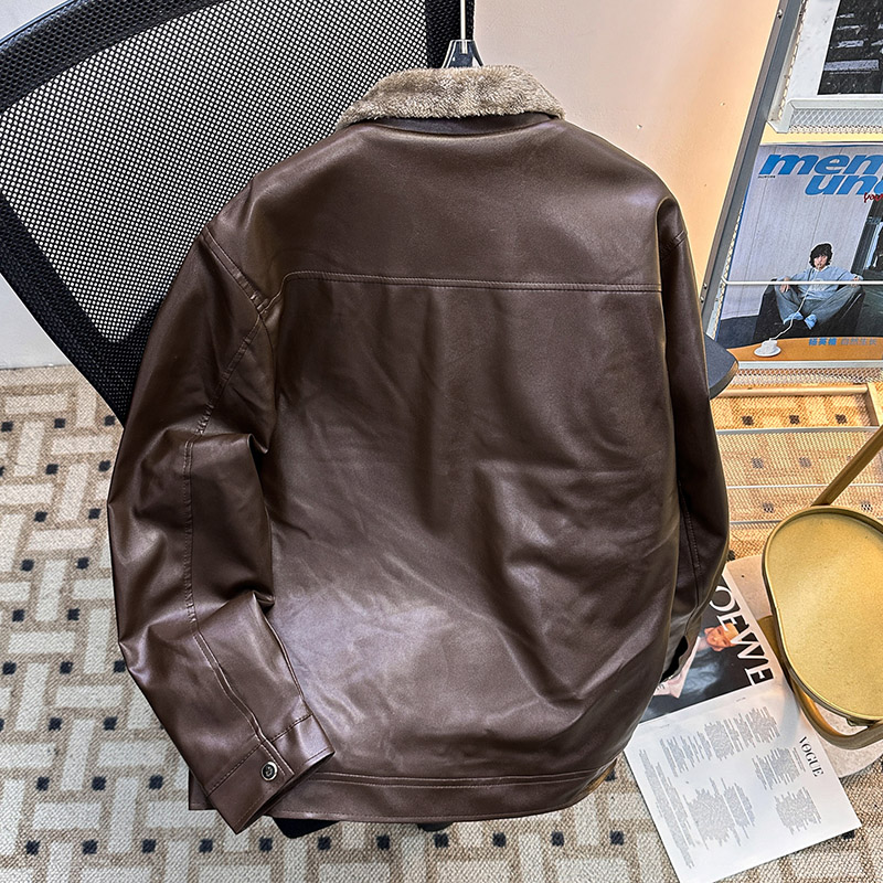 cleanfit工装加绒皮衣夹克男冬季复古哈灵顿加厚翻领短款pu皮外套