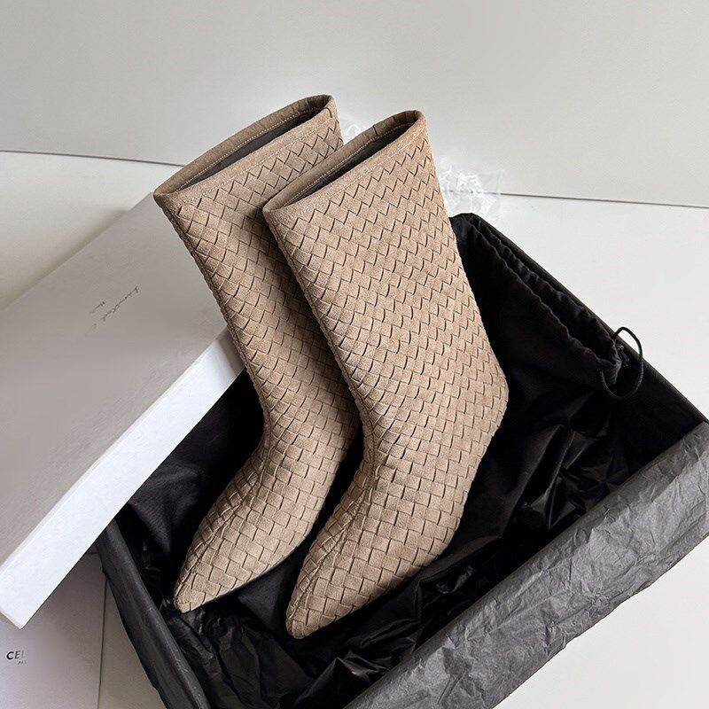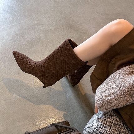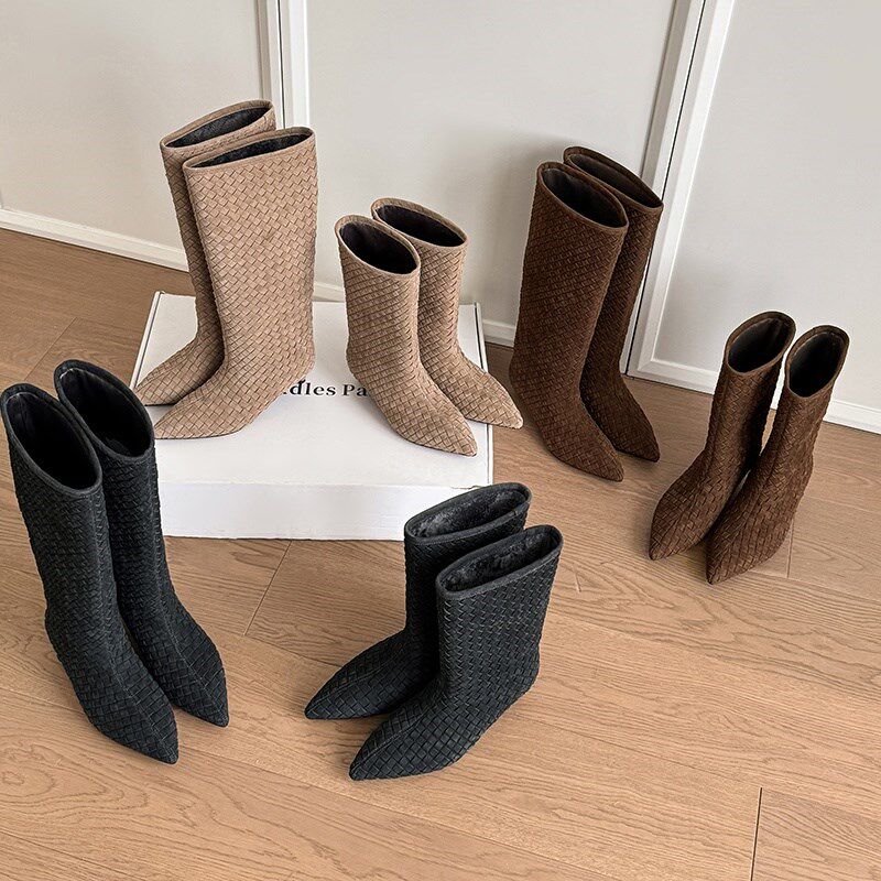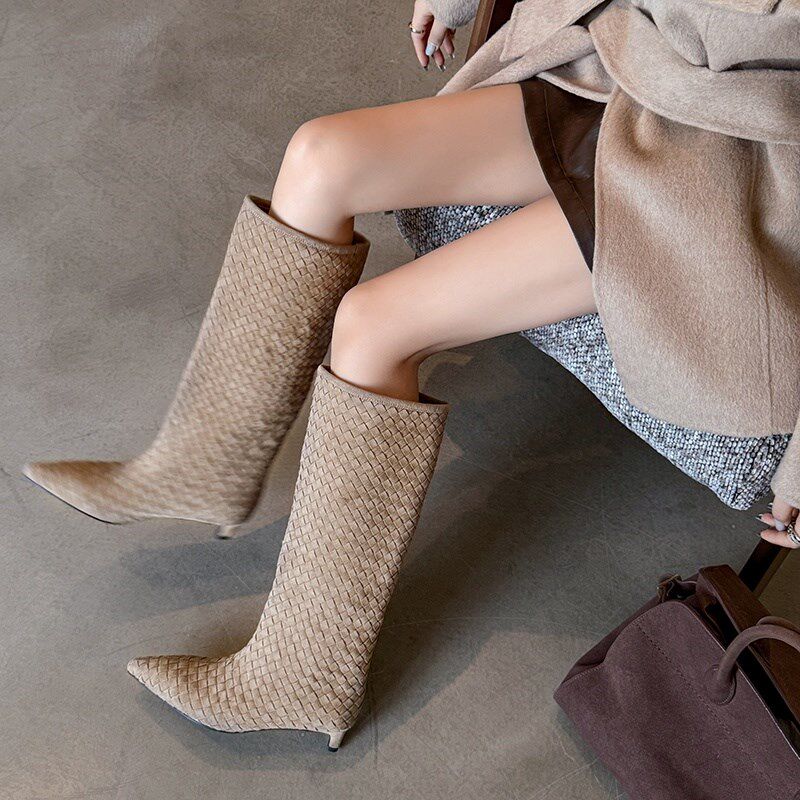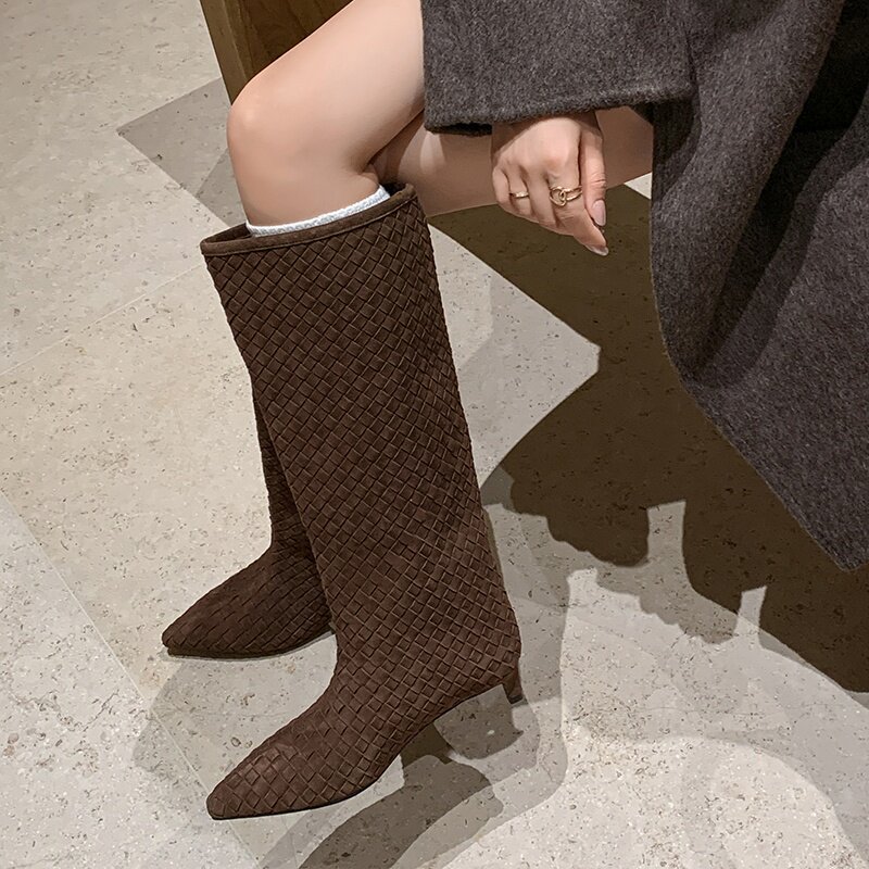 两种筒高全真皮法式复古手工编织翻皮直筒靴小跟洋气时髦短靴女秋