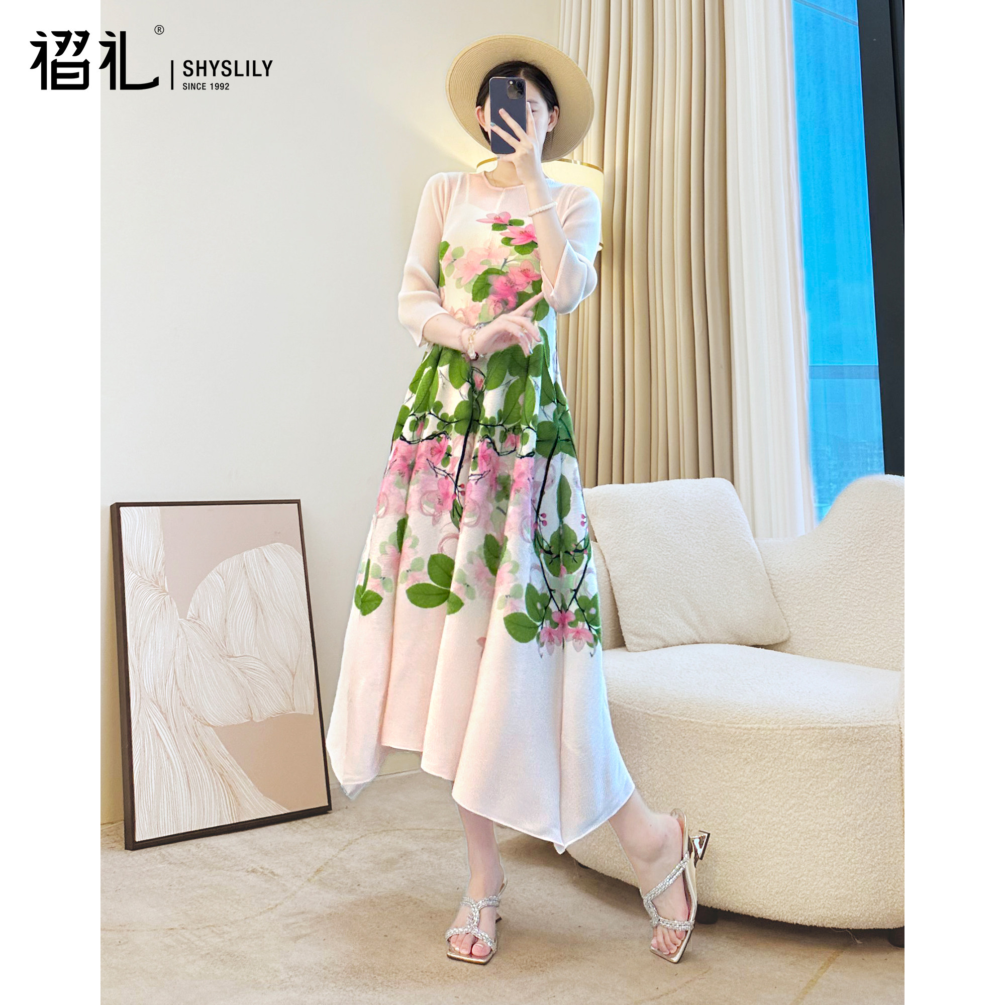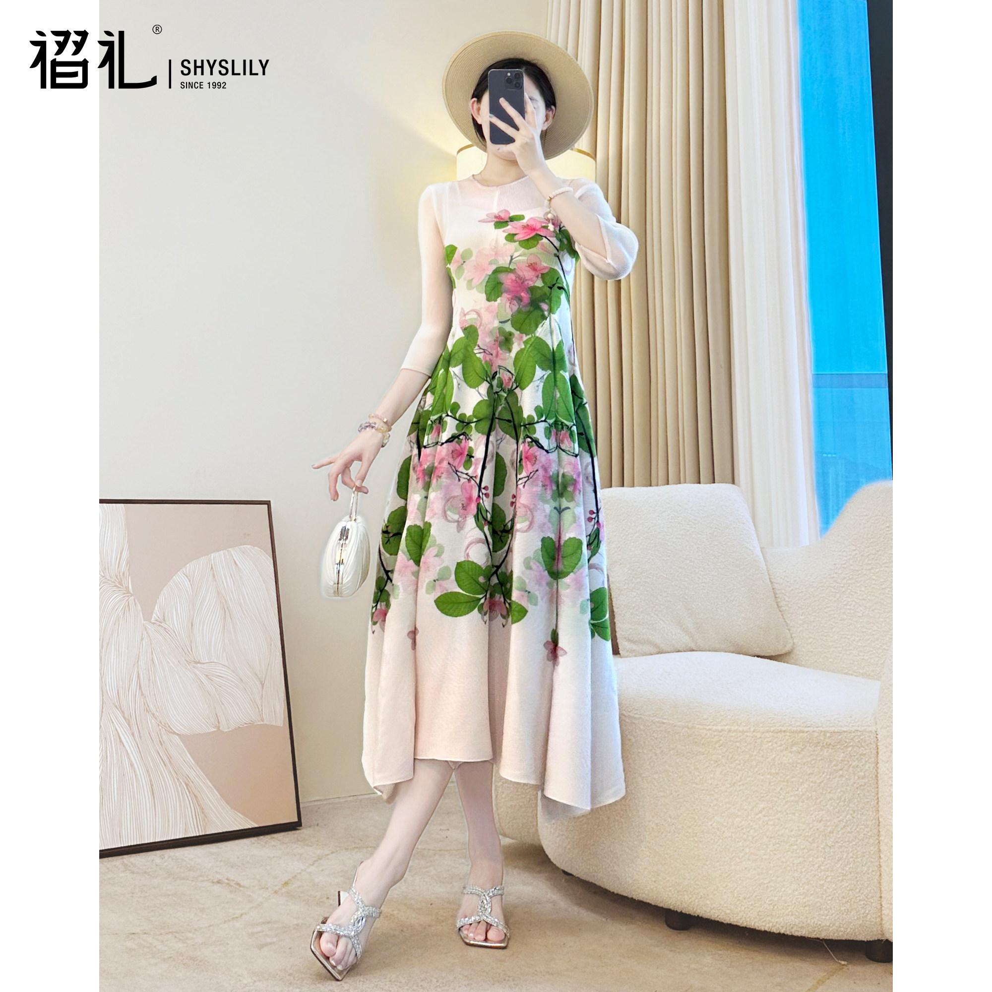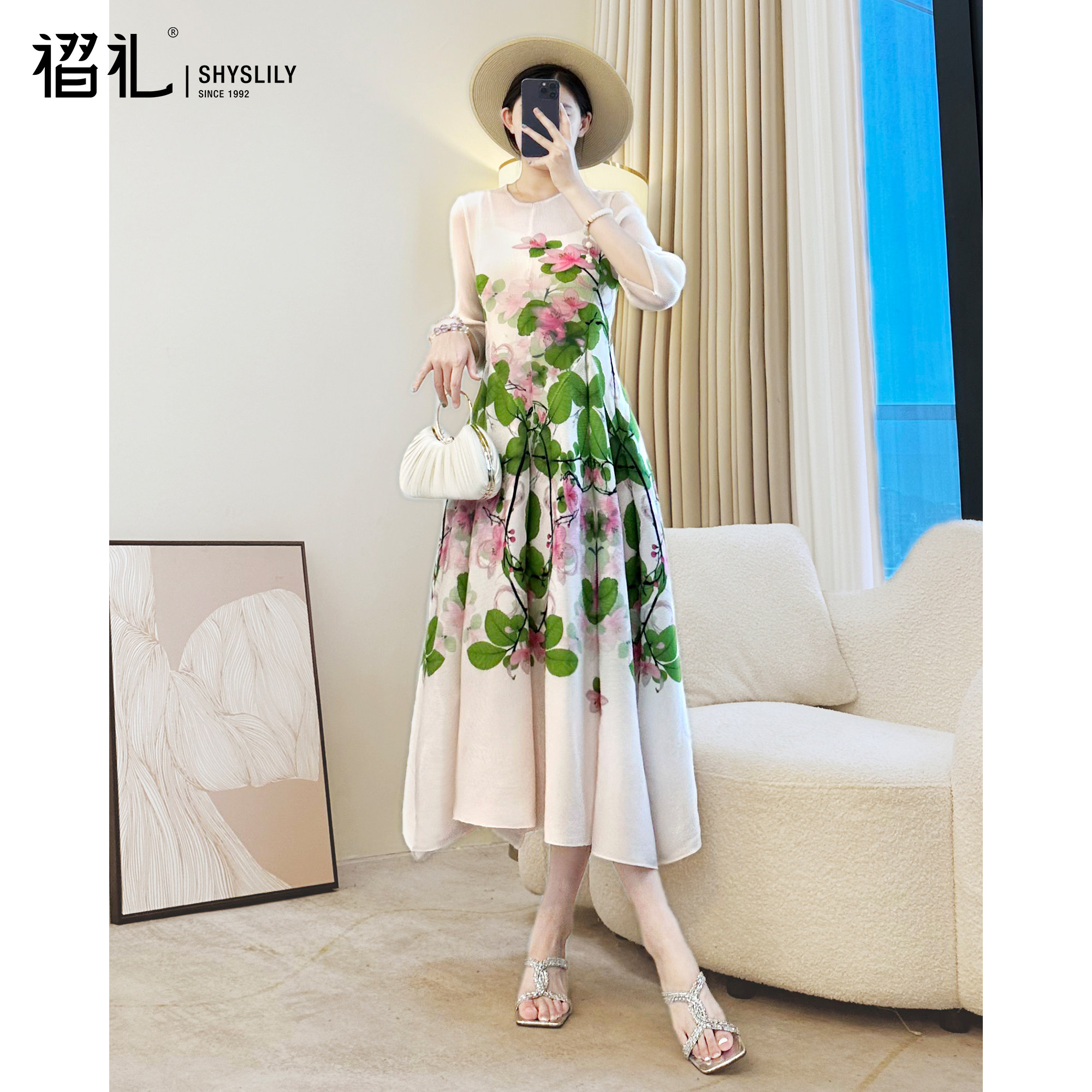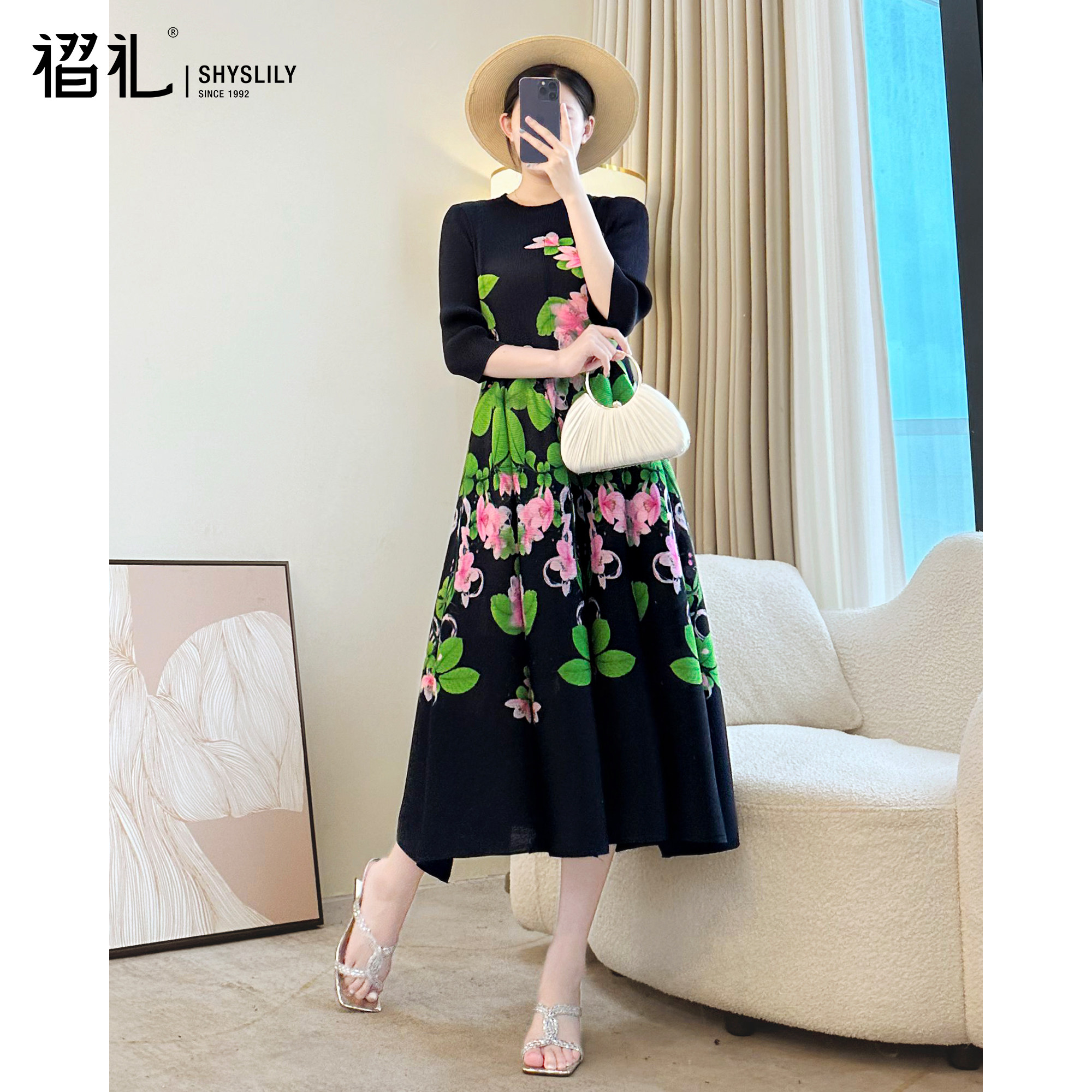 三宅褶皱法式印花连衣裙黑色长裙