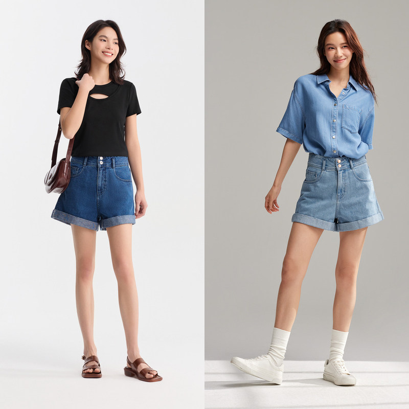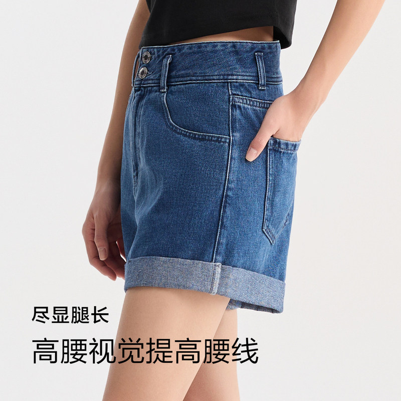 女A字夏高腰牛仔卷边短裤