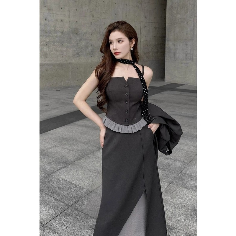 复古时尚秋季2025新款女长袖西装外套抹胸上衣修身显瘦长裙三件套