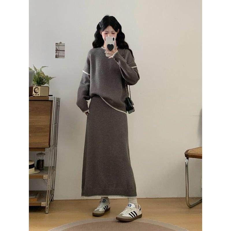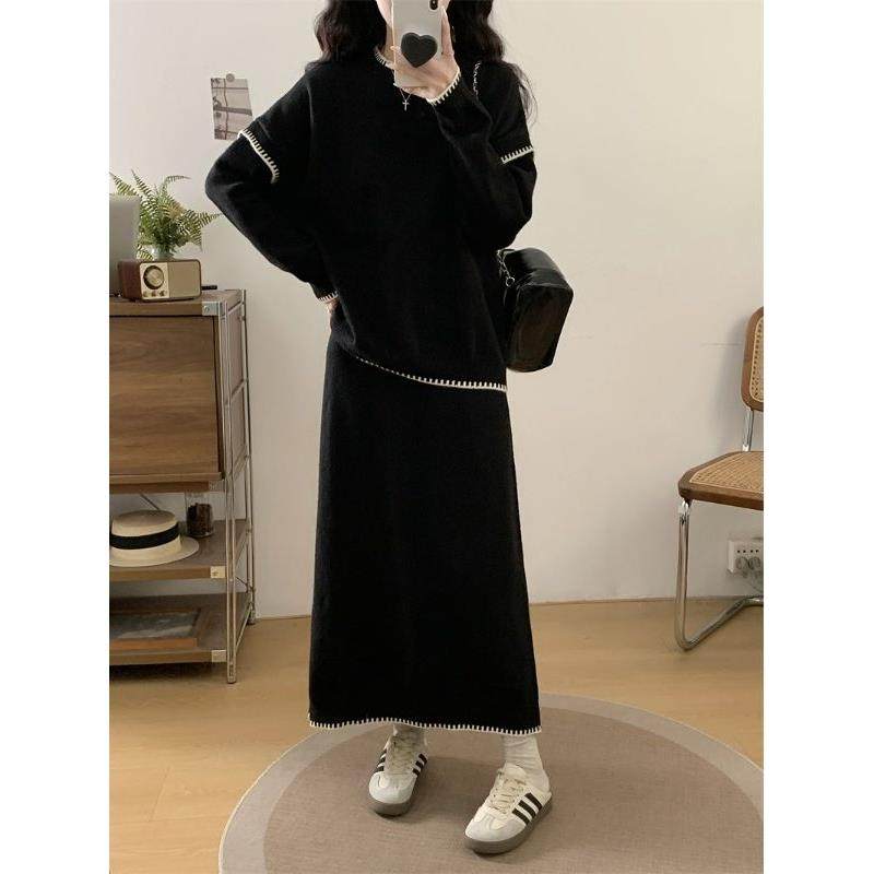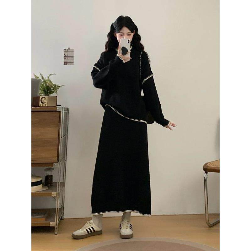 慵懒风撞色毛衣半身裙套装女秋冬大码胖mm韩版时尚显瘦宽松两件套