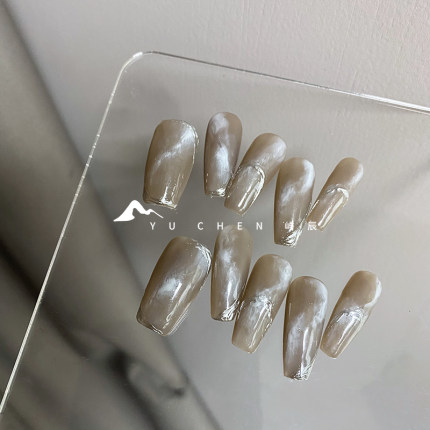 屿辰【裸色白雾鎏金】美甲穿戴甲立体晕染手绘纯手工高级原创设计