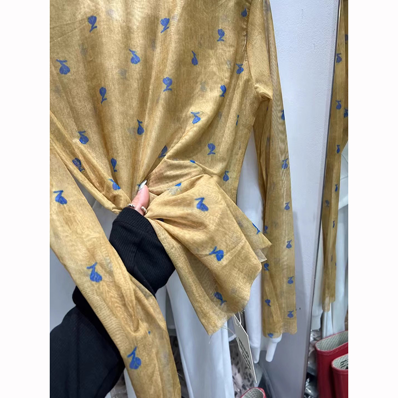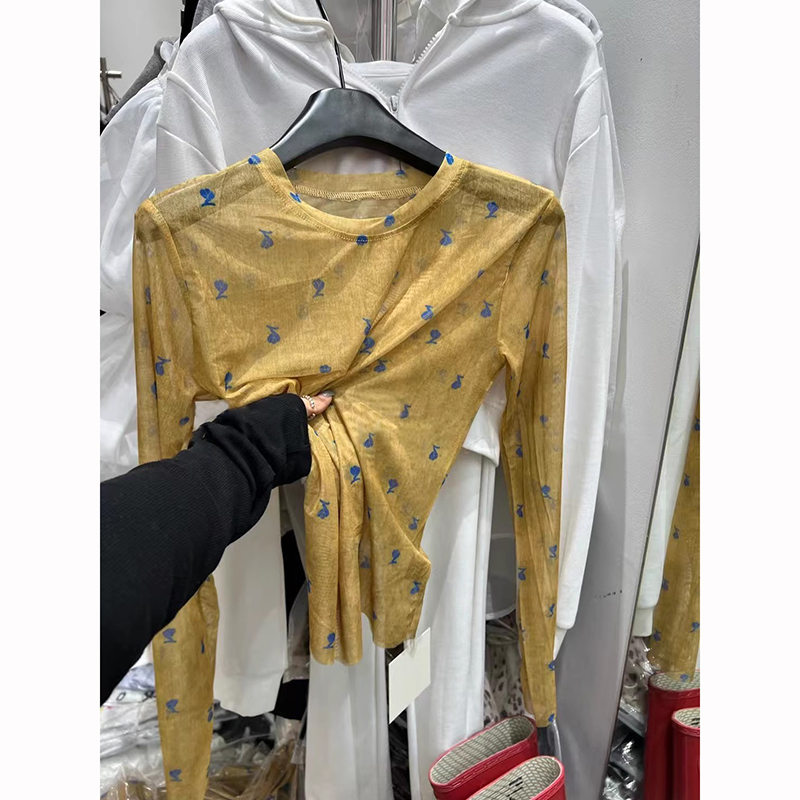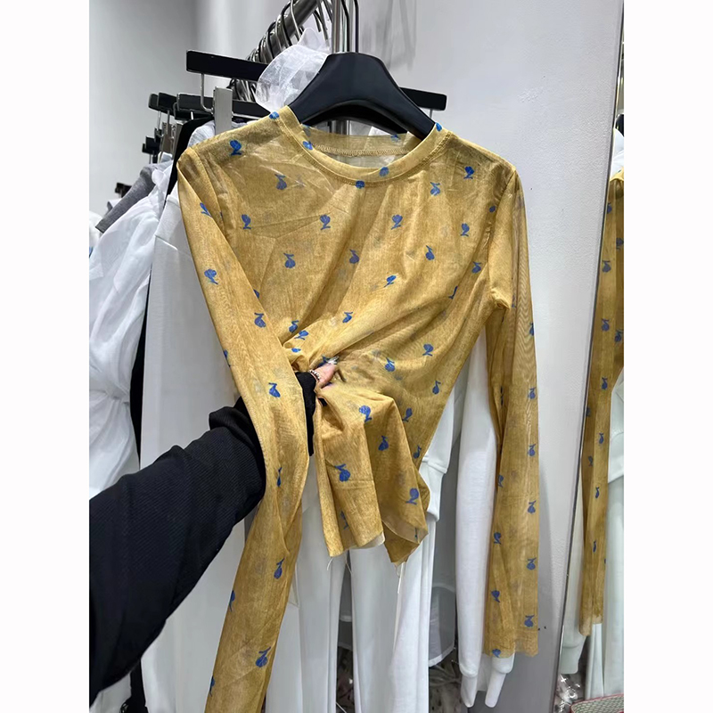 小众花卉印花网纱打底衫修身长袖T恤可外穿薄款内搭女新款