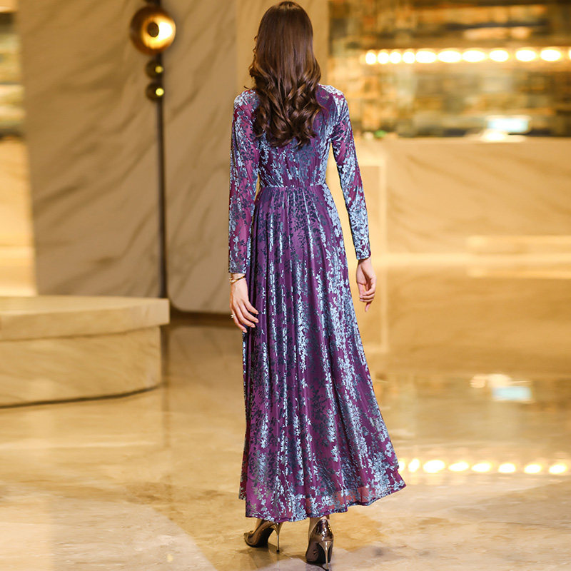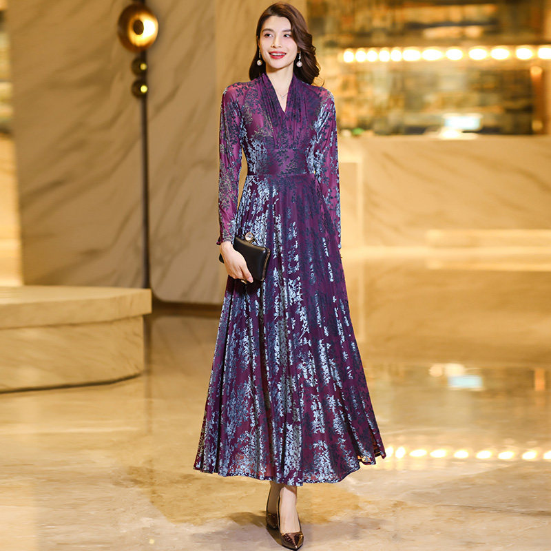 2025新款秋冬季v领长袖提花大摆连衣裙修身显瘦打底裙妈妈长裙子