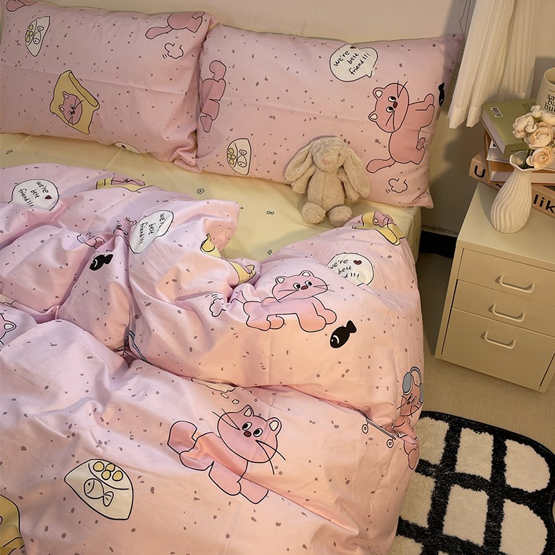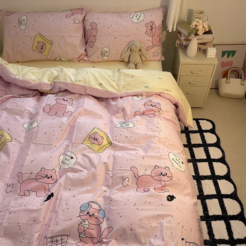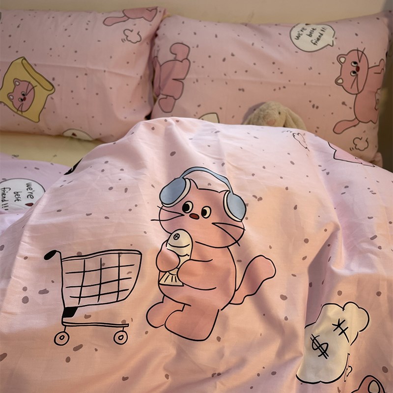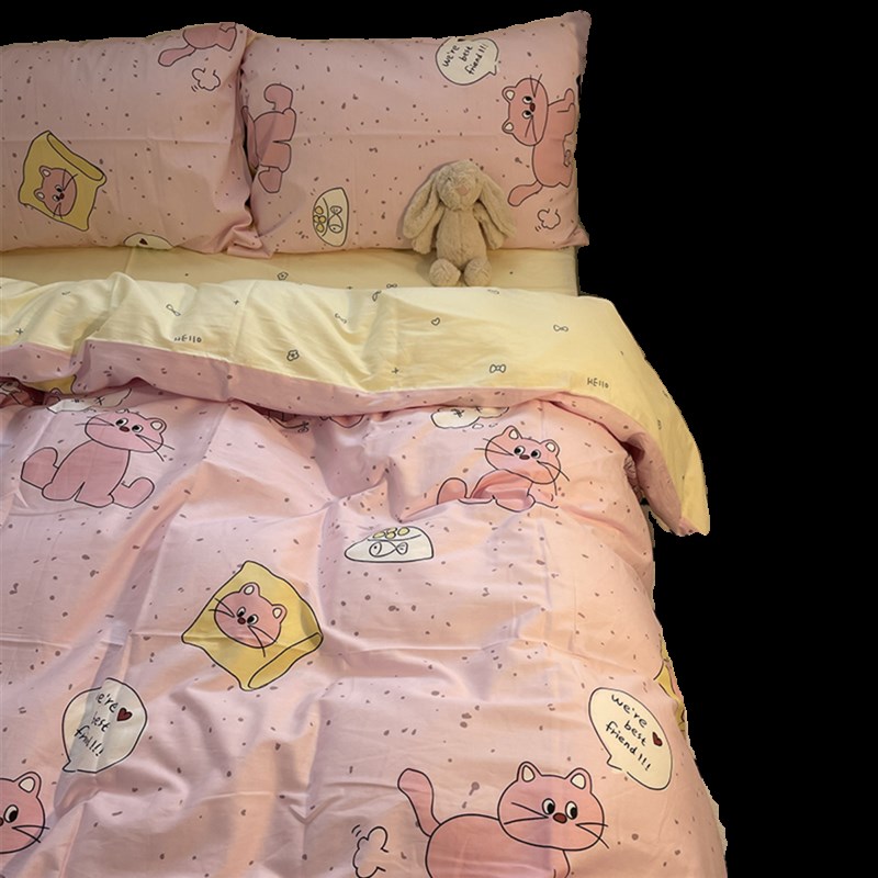 可爱摸鱼猫四件套全棉少女心卡通被套床单宿舍三件套床上用品