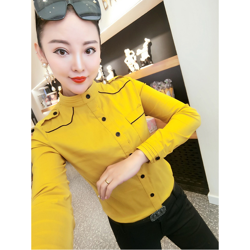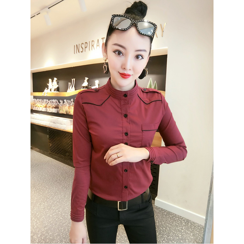欧洲站立领纯色衬衫女长袖韩版秋冬新款修身打底衫弹力棉布衬衣潮