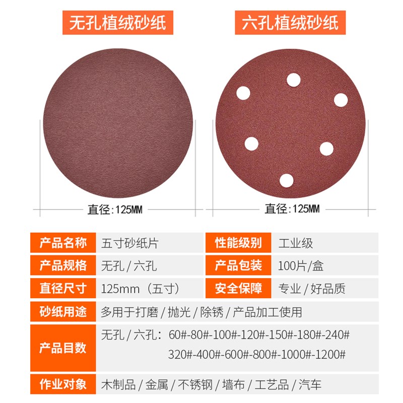 5寸砂纸片125mm气动打磨机植绒砂皮自贴拉绒圆盘木工打磨抛光沙纸