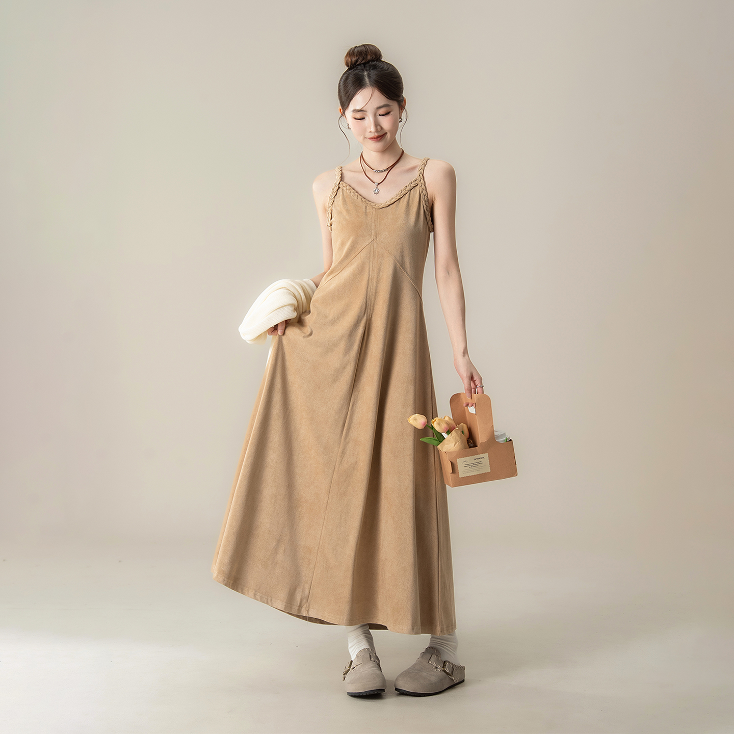 卡其色麻花肩带收腰显瘦吊带连衣裙女早秋新款温柔风针织开衫套装