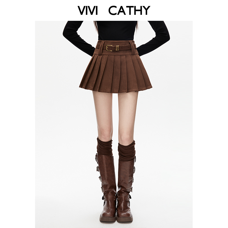 VIVICATHY2025秋冬高腰麂皮绒百褶半身裙女气质显瘦佰搭a字短裙
