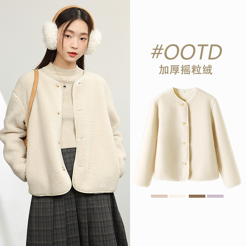 班尼路S&K咖色摇粒绒外套女秋冬季2025新款小香风上衣开衫夹克H