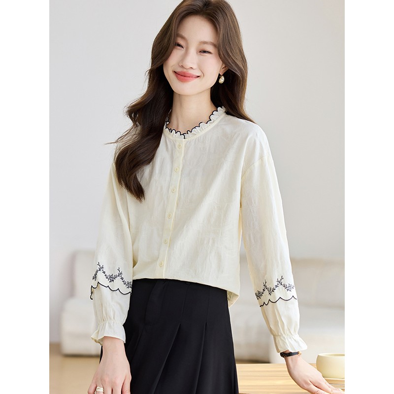 纯棉刺绣长袖衬衫女春秋季高级感爆款木耳边职业衬衣打底全棉上衣