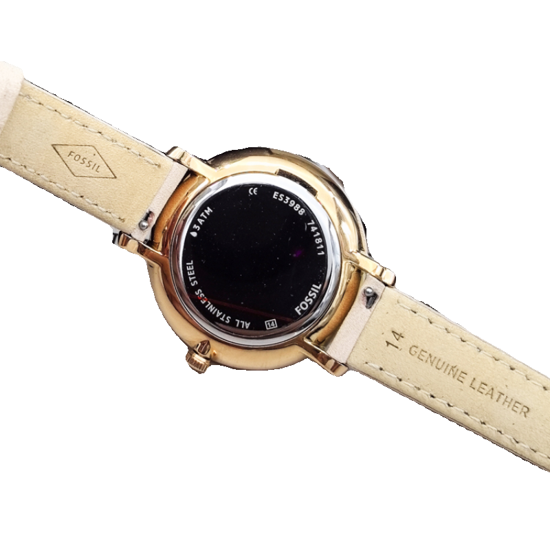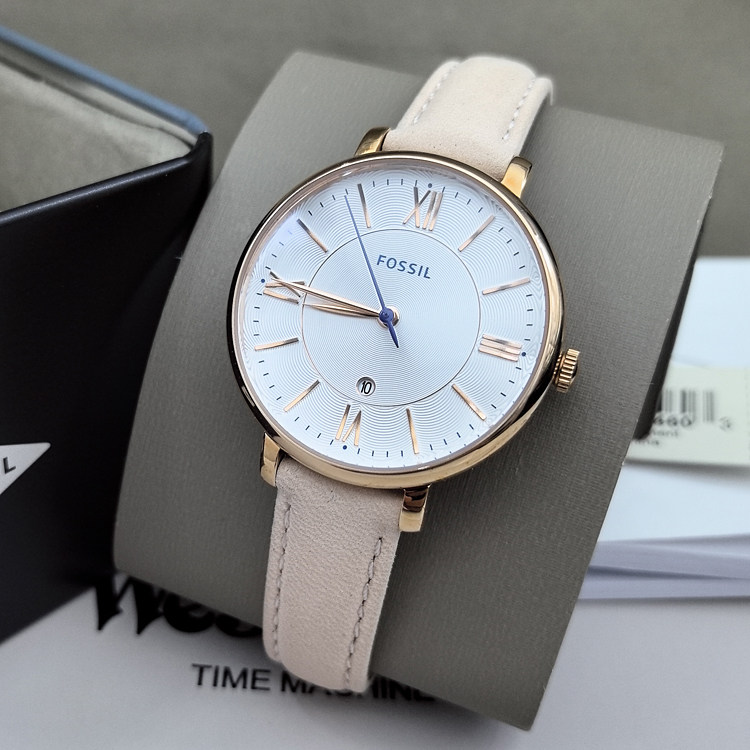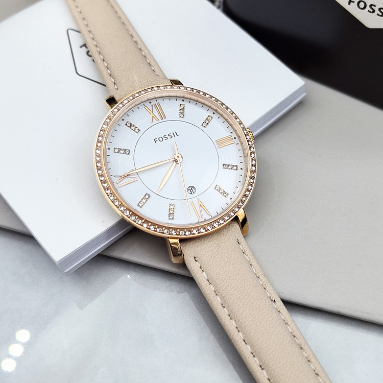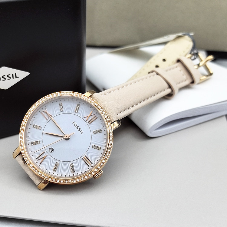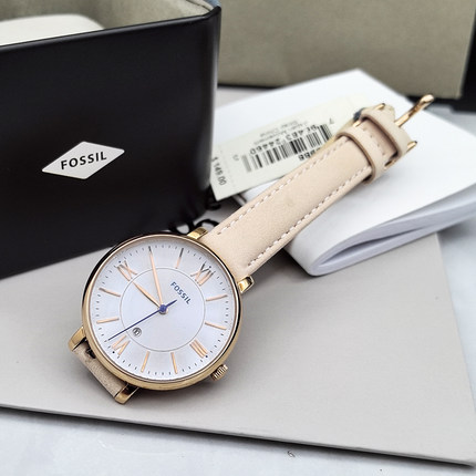 FOSSIL手表粉色真皮表带玫瑰金轻奢简约休闲石英表防水日历女表