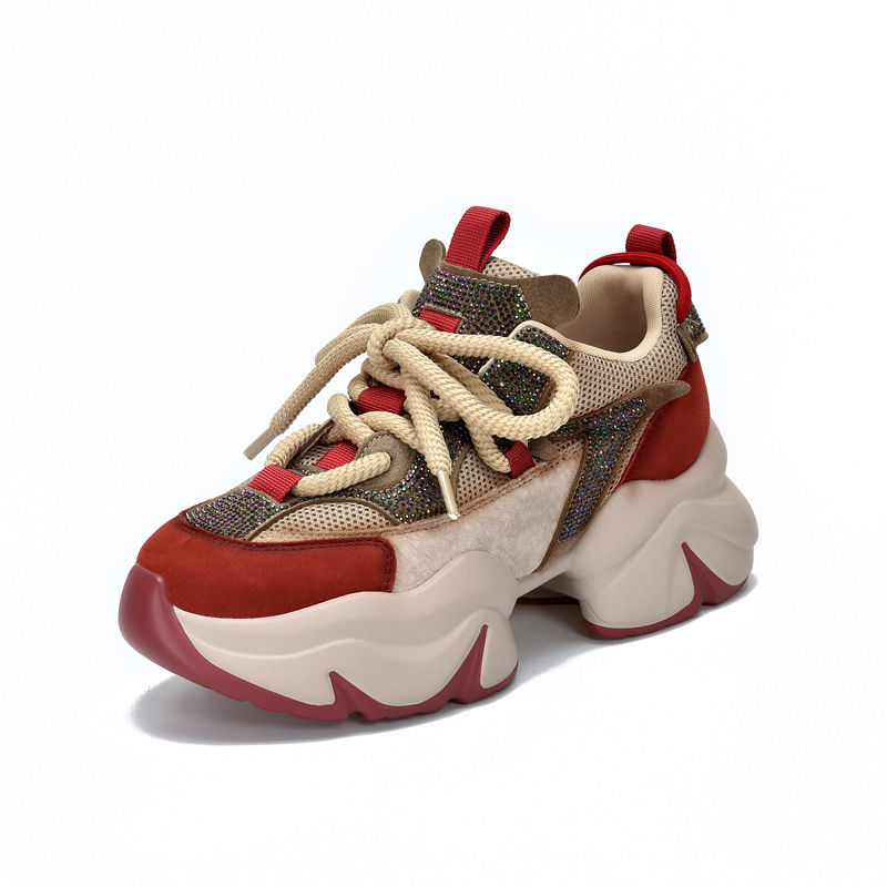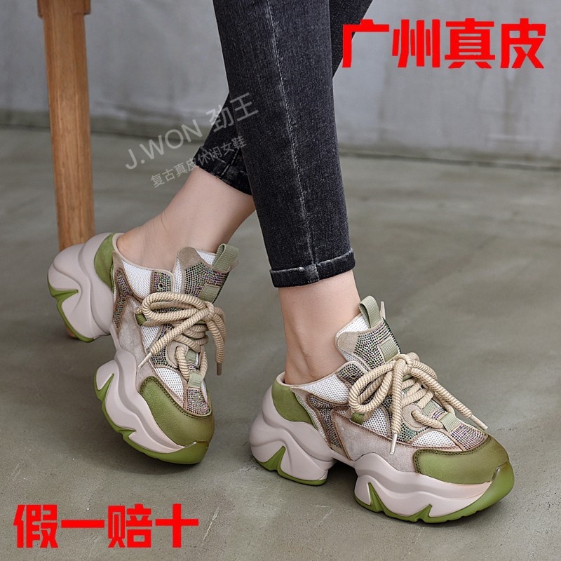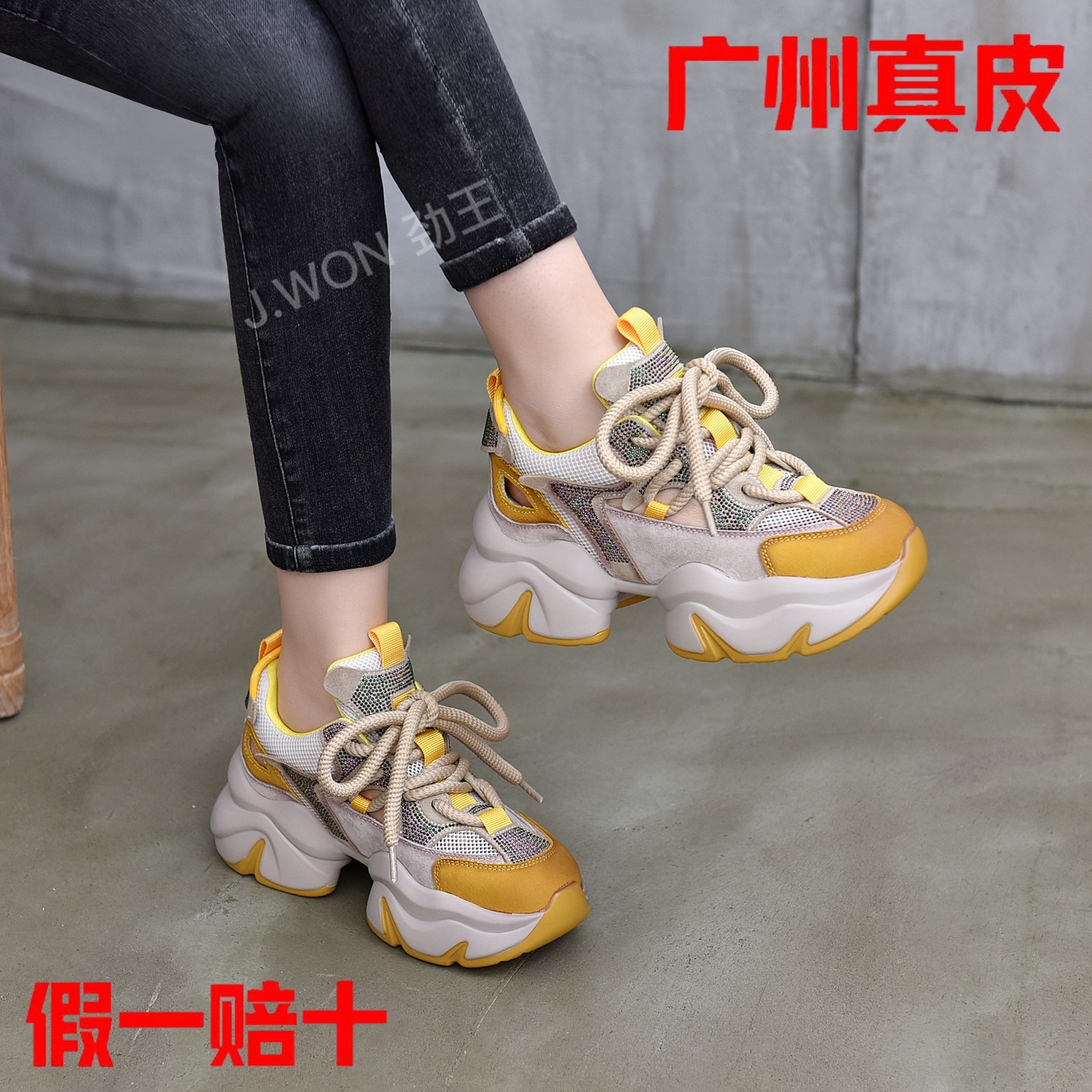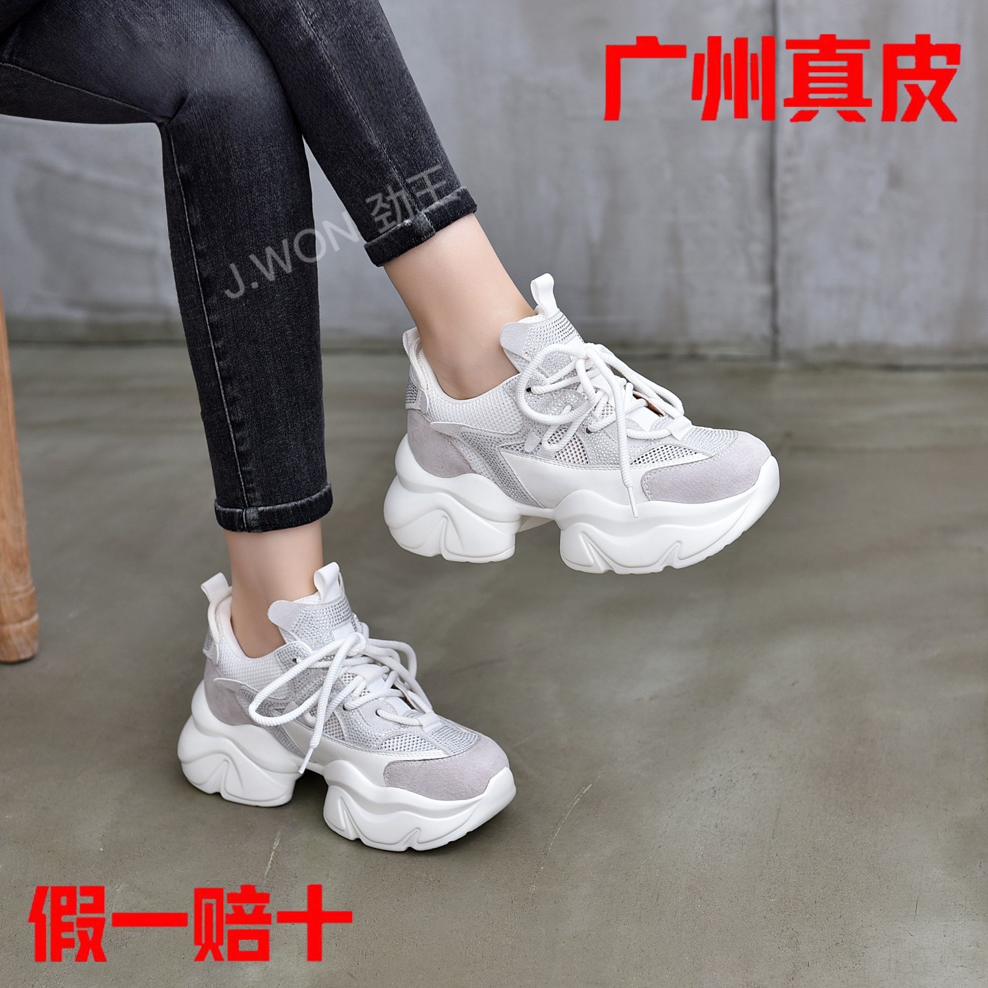 劲王头层牛皮透气网面厚底老爹鞋女2025新款真皮夏款透网烫钻网鞋