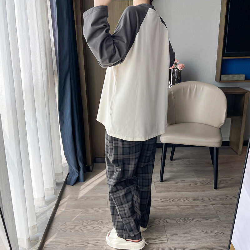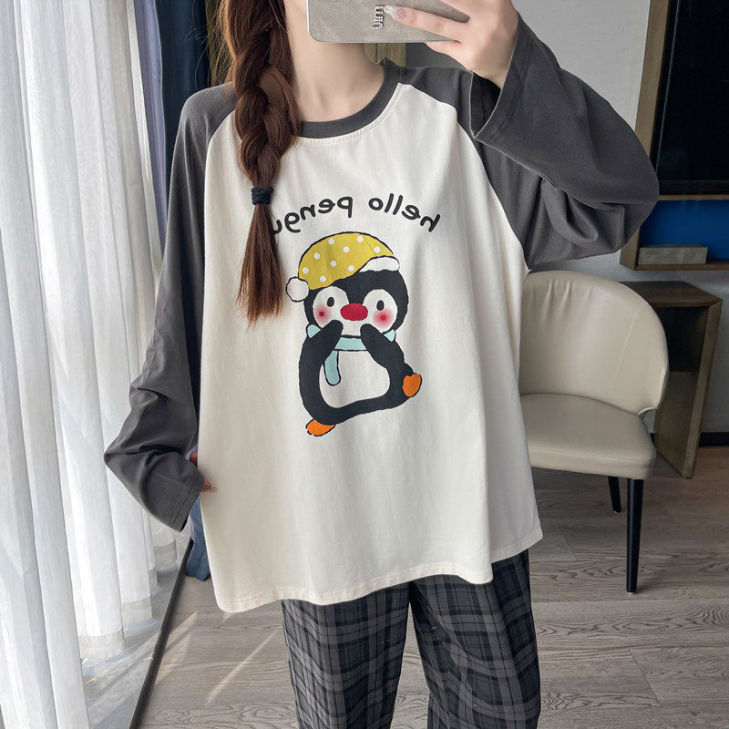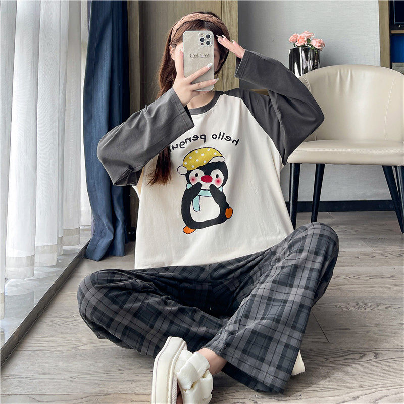 纯棉加肥大码睡衣女200斤长袖长裤宽松卡通格子春秋季家居服套装
