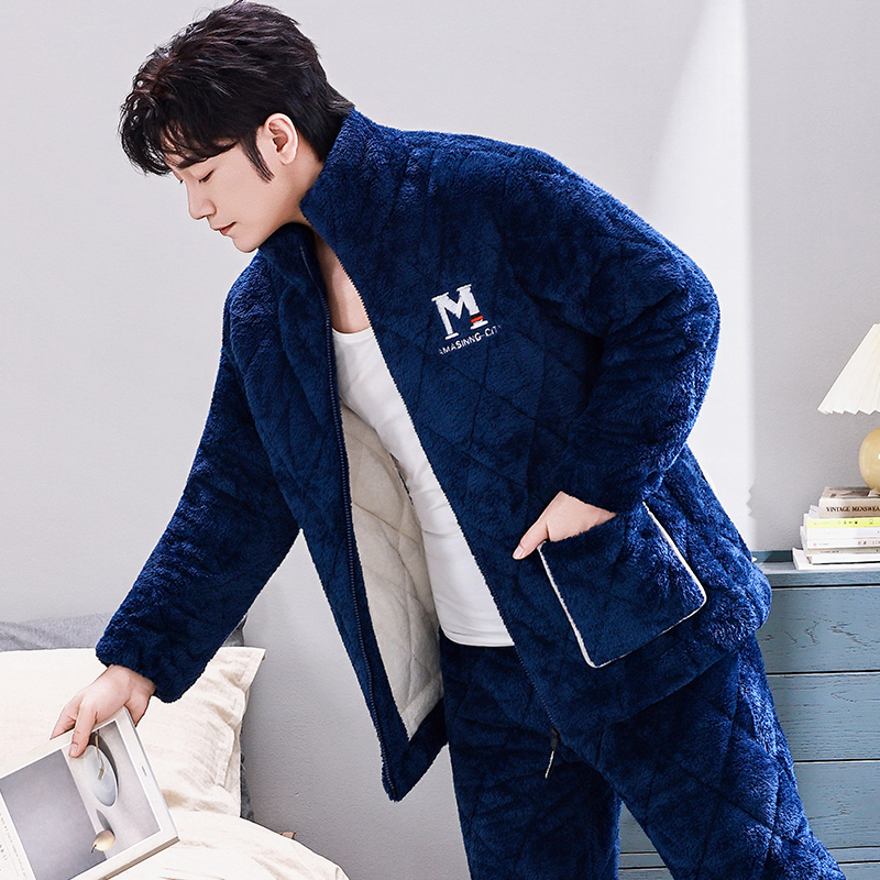 冬季珊瑚绒男士睡衣三层夹棉加厚加绒法兰绒秋冬款家居服保暖套装