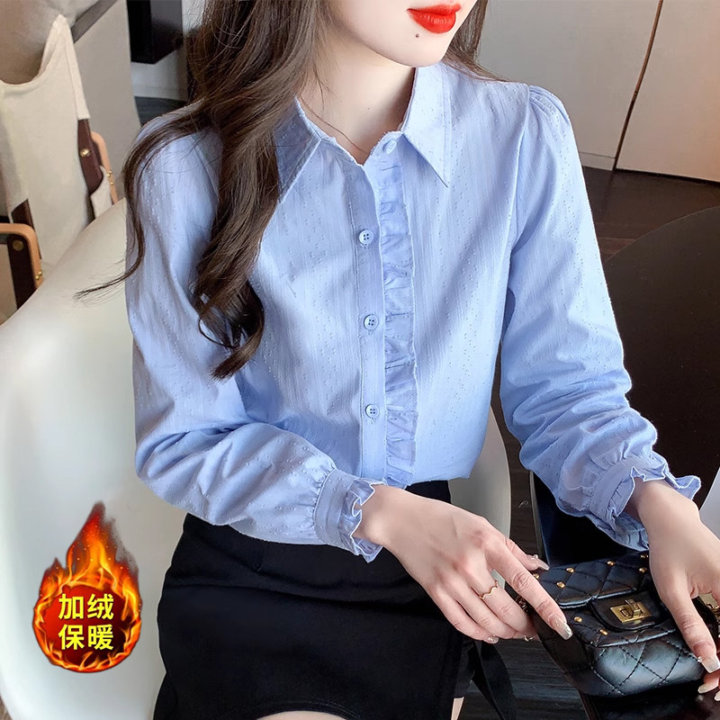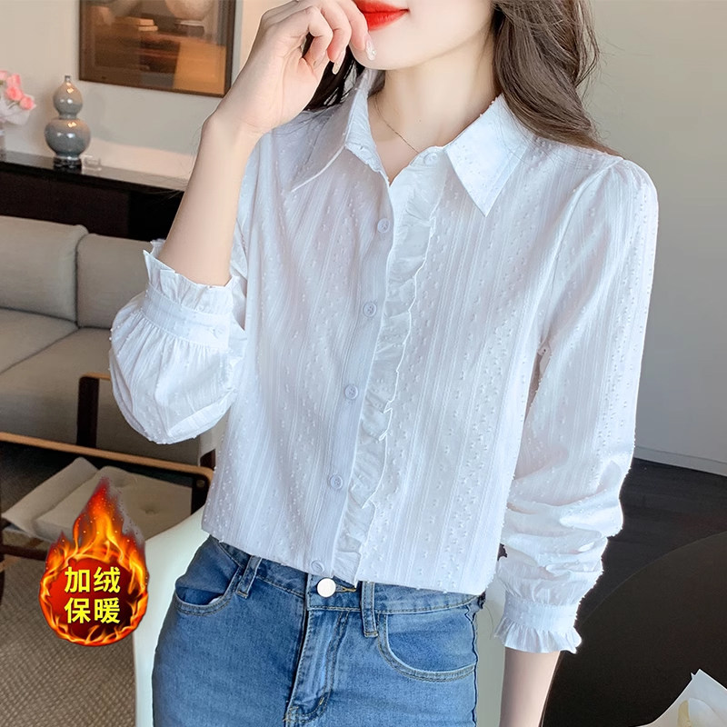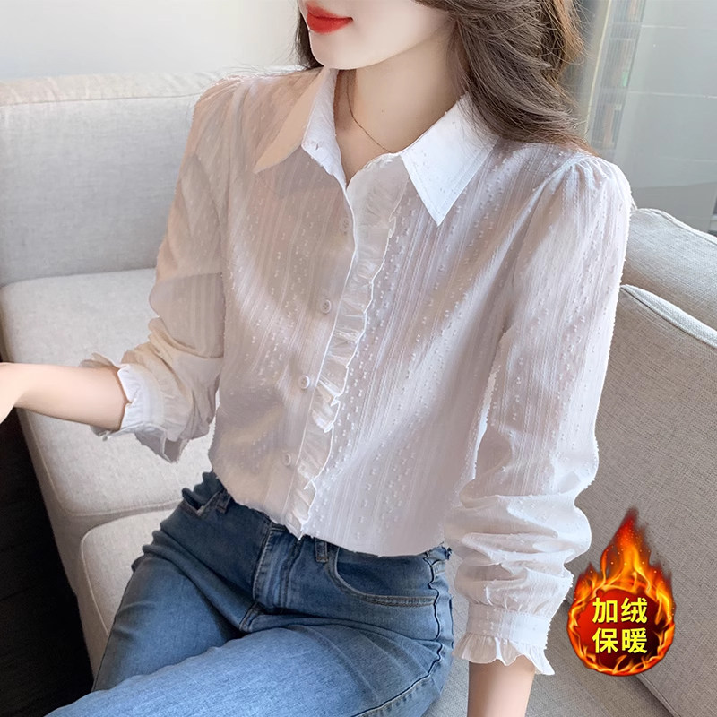白衬衫女2026秋冬新款法式木耳边单排扣全棉衬衣加绒加厚打底上衣