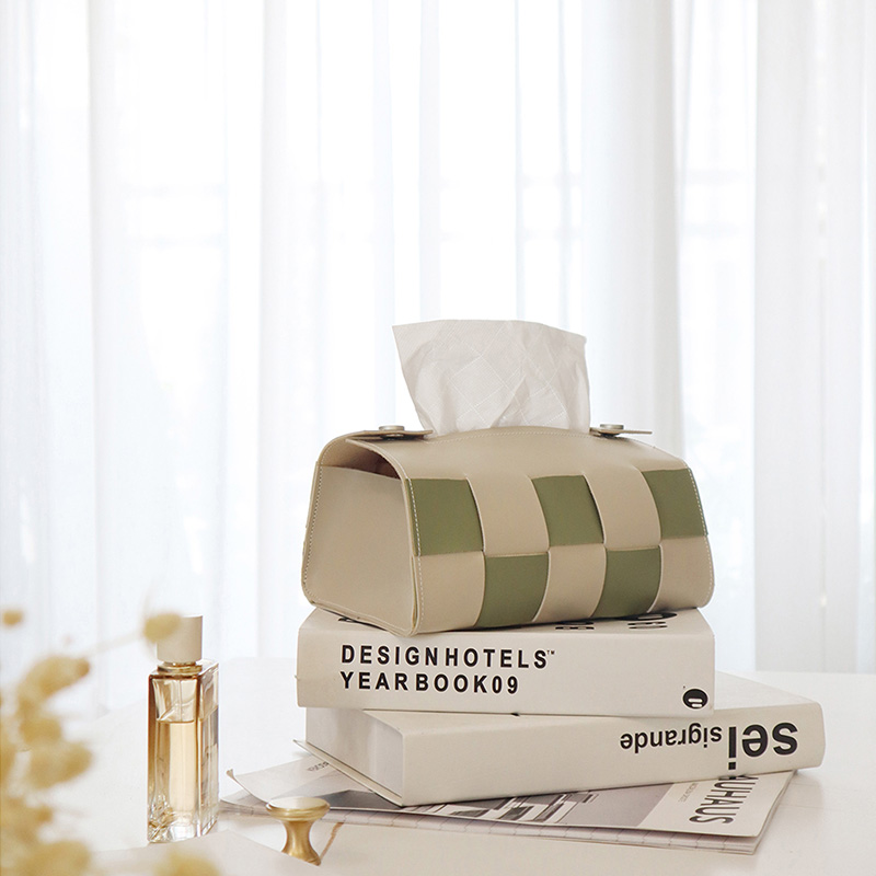 米色牛油果绿抽纸盒客厅车载家用置物盒马鞍皮编织棋盘格纸巾盒