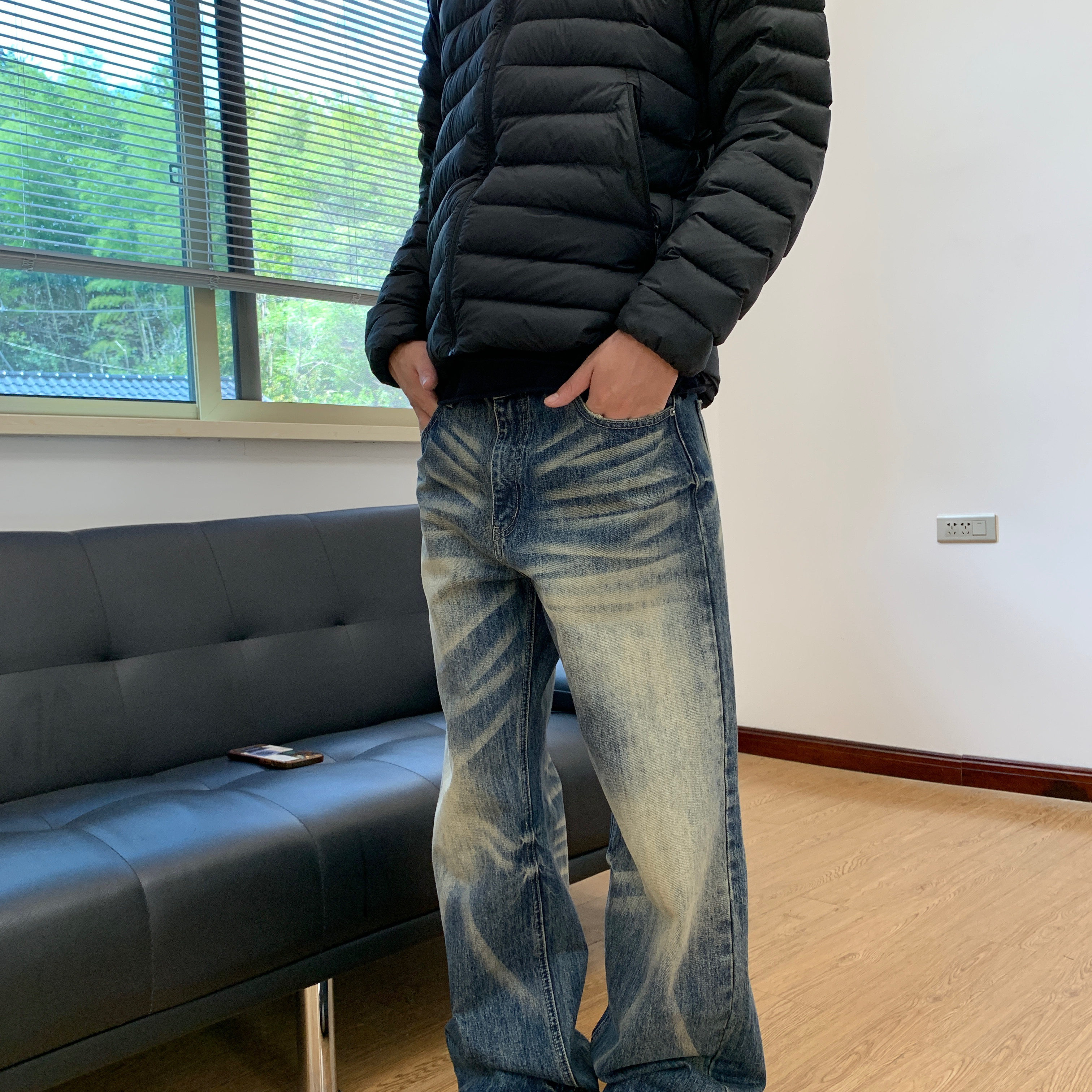 07QWER 秋冬季老钱风水洗做旧猫须牛仔裤潮宽松阔腿男女通勤休闲
