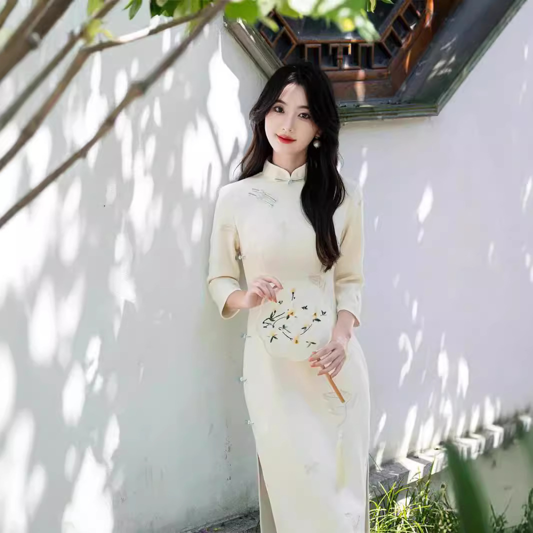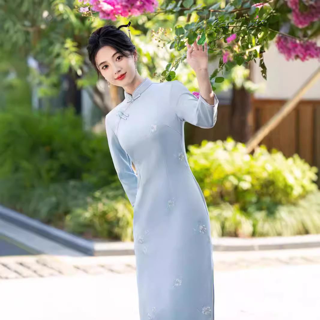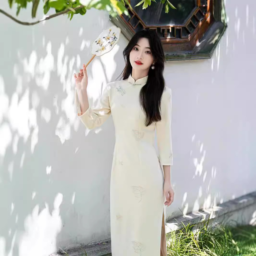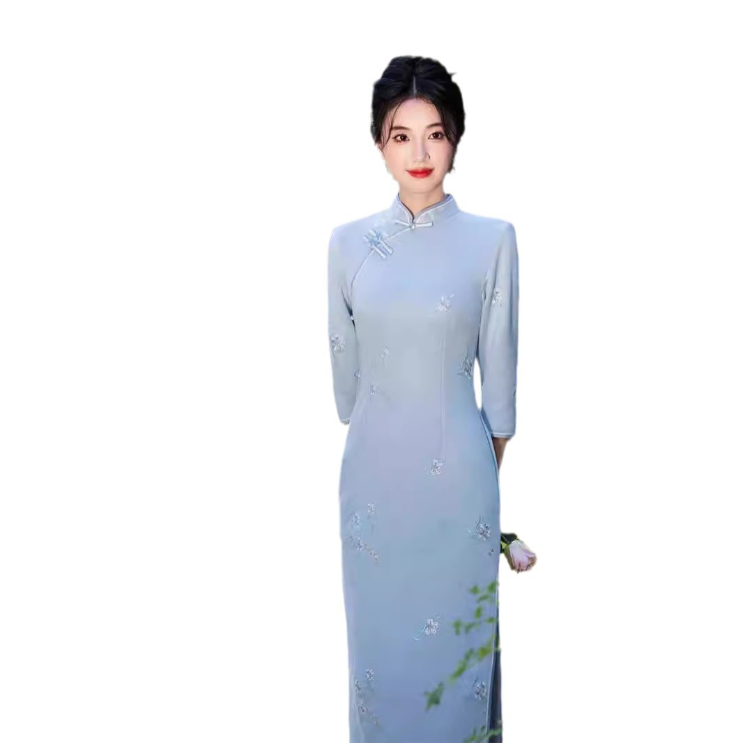 2025秋季新款 雪花绒绣花长款时尚旗袍年轻款端气质修身女旗袍