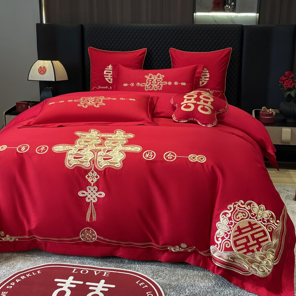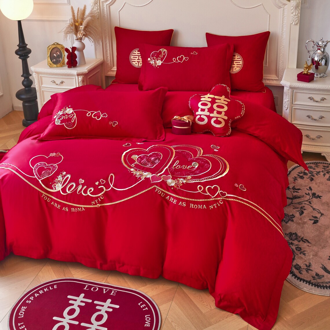 新婚庆四件套全棉纯棉大红色简约高端刺绣结婚礼婚房喜庆床上用品