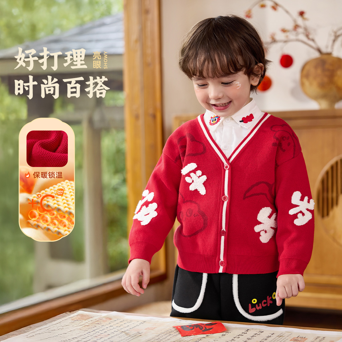 宝宝毛衣纯棉红色新年服男童开衫女童上衣冬款童装儿童外套过年服