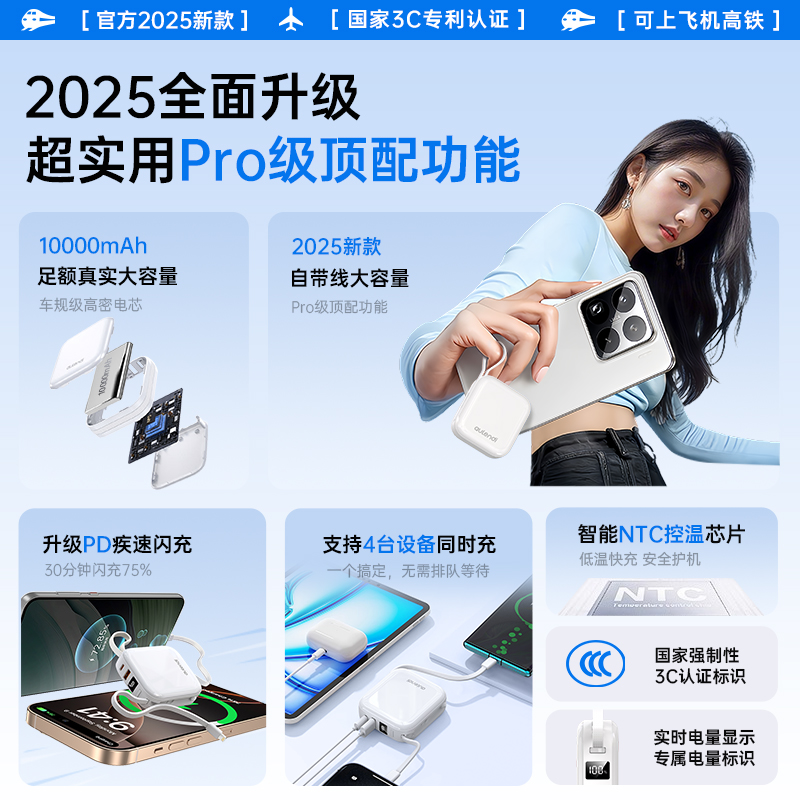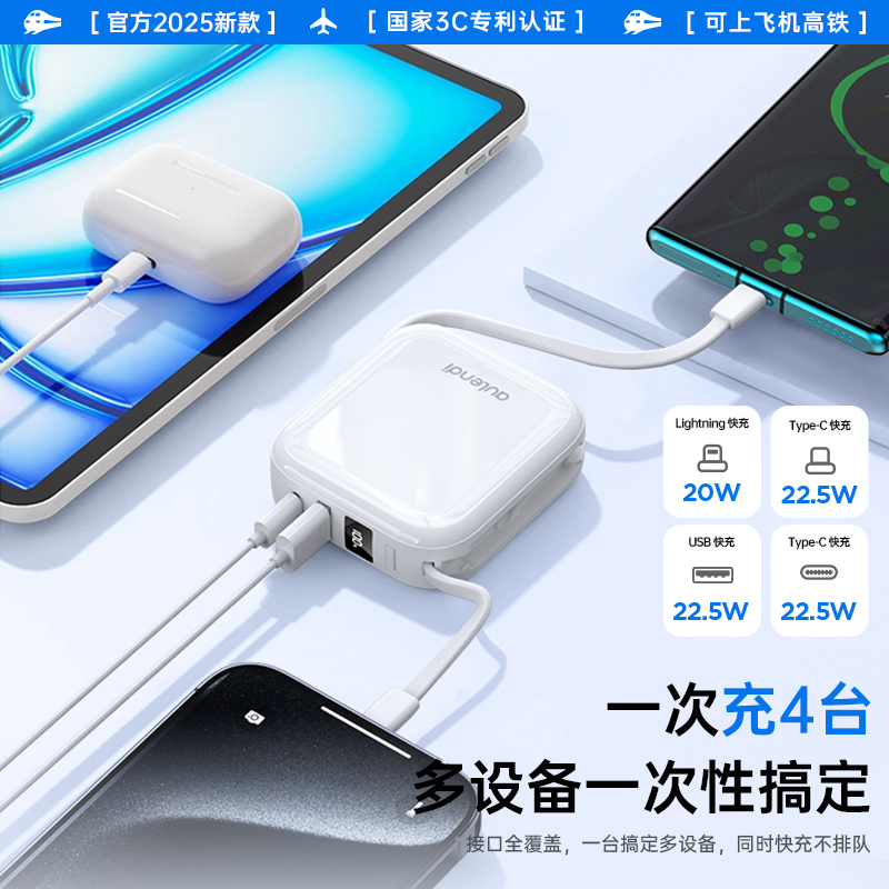 【3c认证政府补贴】充电宝快充自带线迷你小巧便携ccc认证适用小米华为苹果移动电源大容量可上飞机2025新款