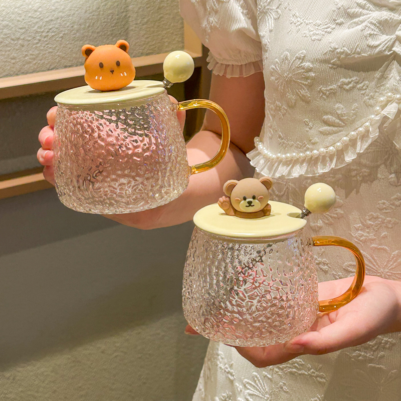 可爱小熊玻璃杯带盖勺女生高颜值喝水杯子大容量马克杯情侣咖啡杯