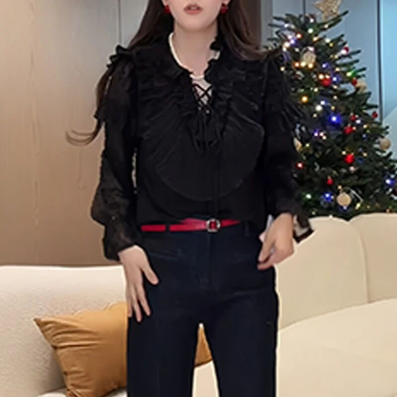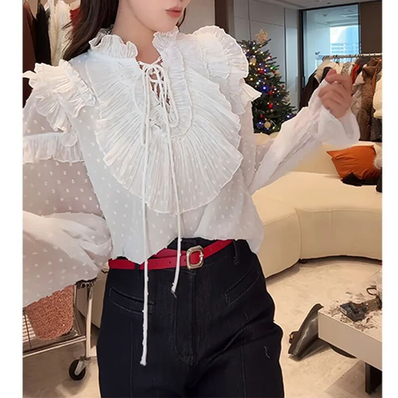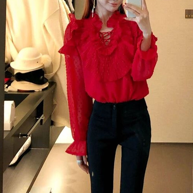 新年穿搭红色波点衬衫女2026春季荷叶边褶皱系带高级感减龄上衣潮