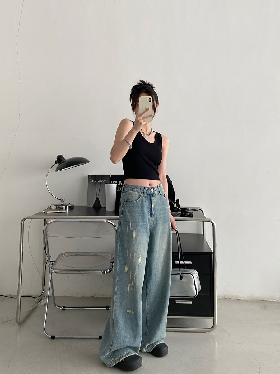 夏季复古水洗抓痕牛仔裤女宽松