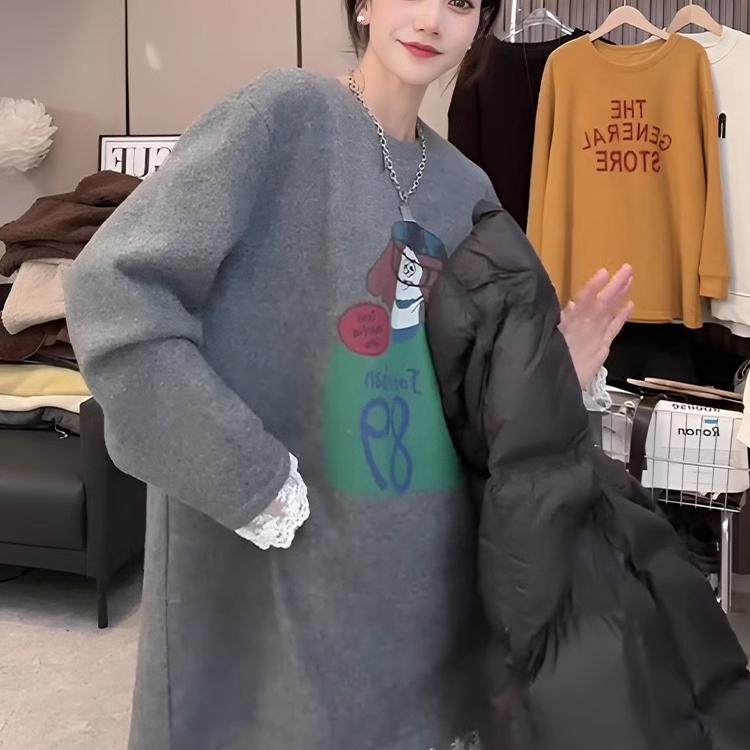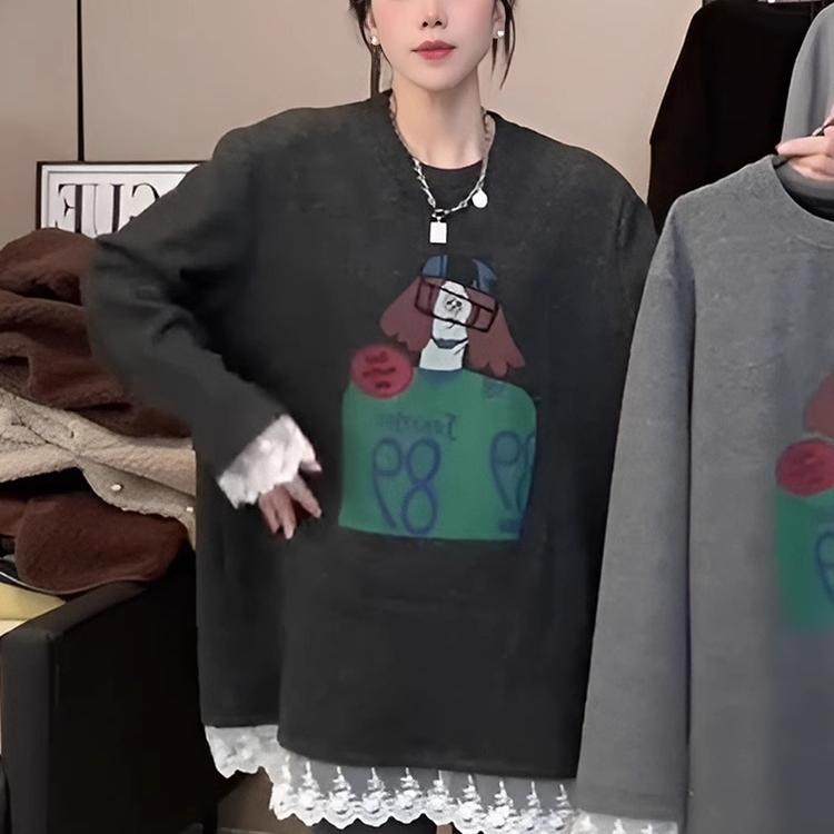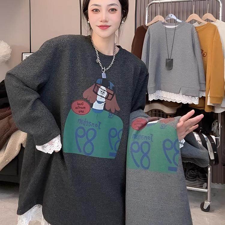 欧货卡通印花加绒加厚卫衣女秋冬新款蕾丝拼接宽松休闲百搭打底衫