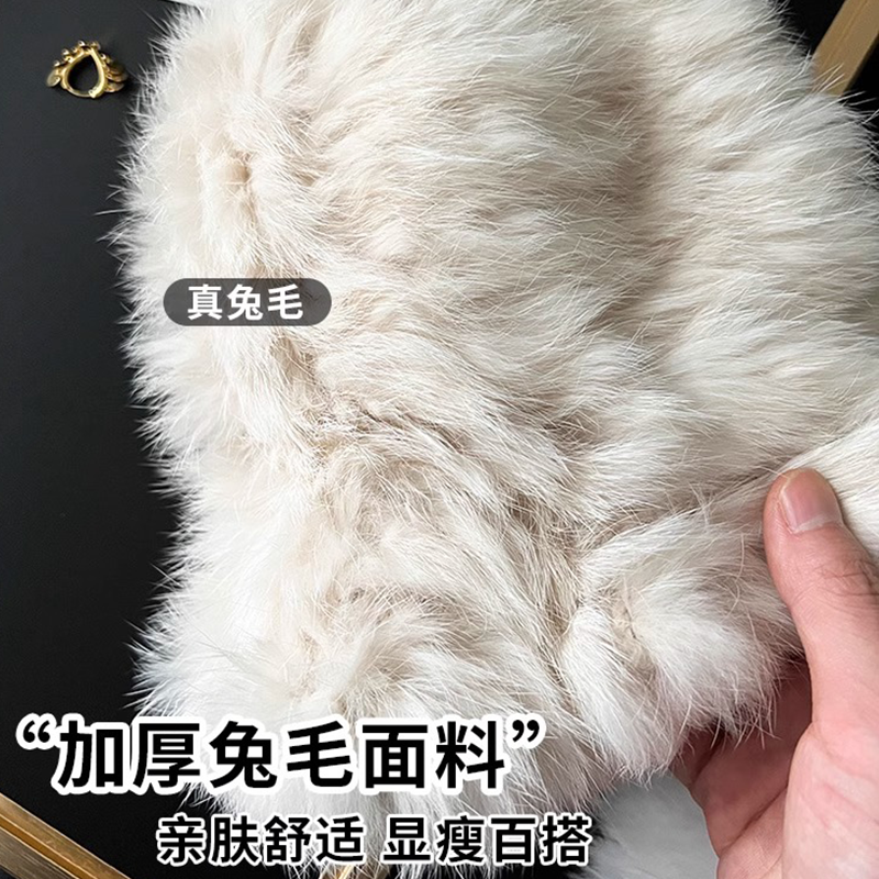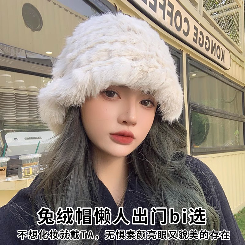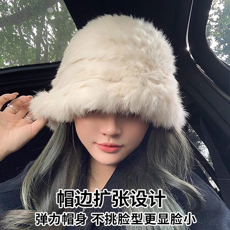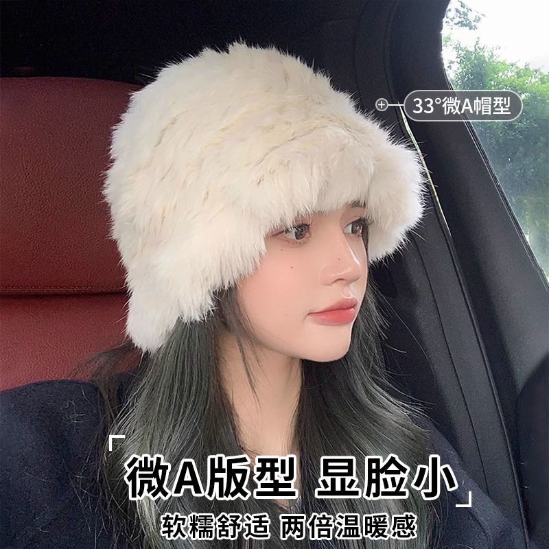 真兔毛云朵白色毛绒帽子女秋冬季保暖显脸小护耳毛线帽针织渔夫帽