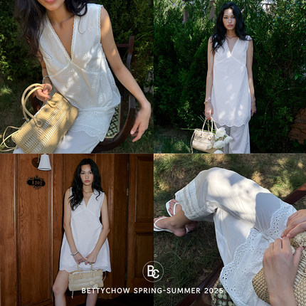 Bettychow 白色棉麻刺绣背心连衣裙9分裤度假风休闲纯色仙气套装