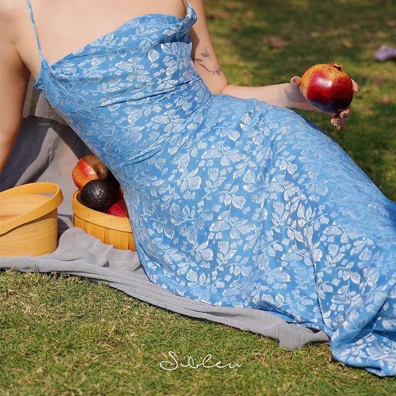 sibleu法式连衣裙小众蓝色真丝吊带露背初秋新中式穿搭清冷松弛感