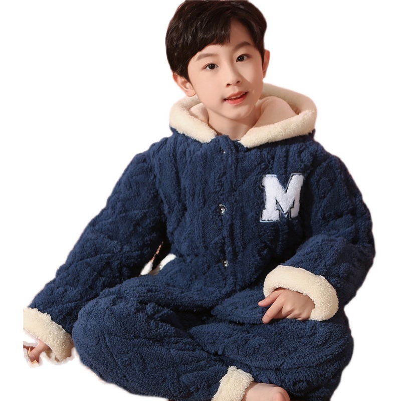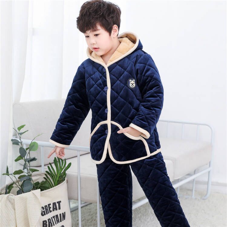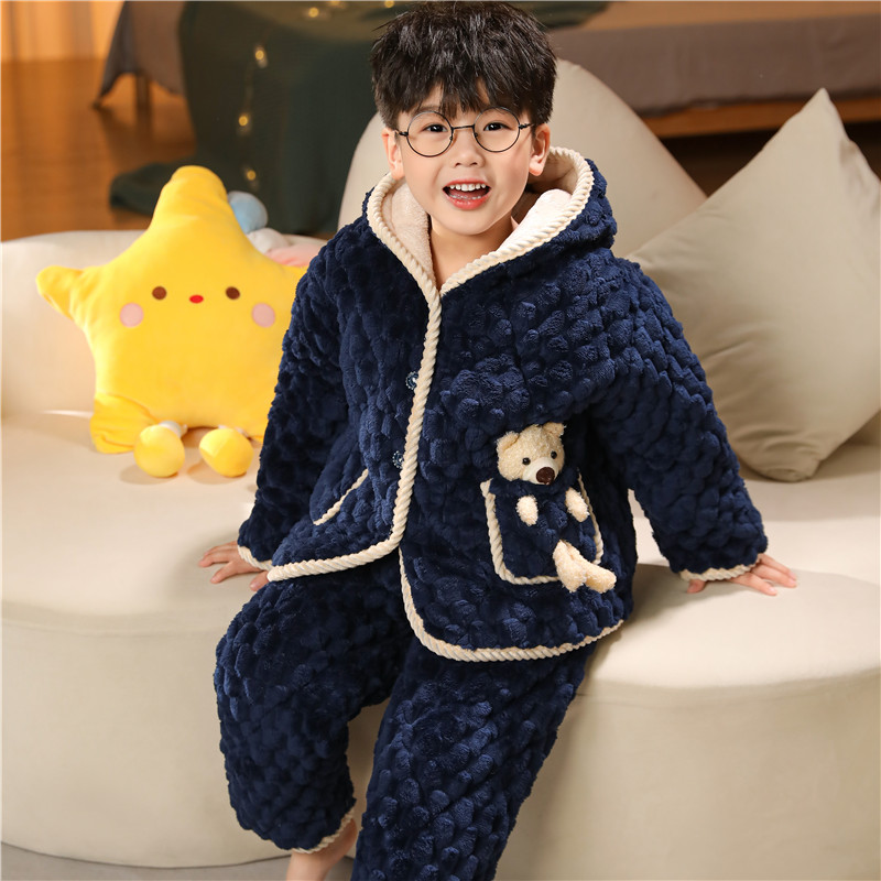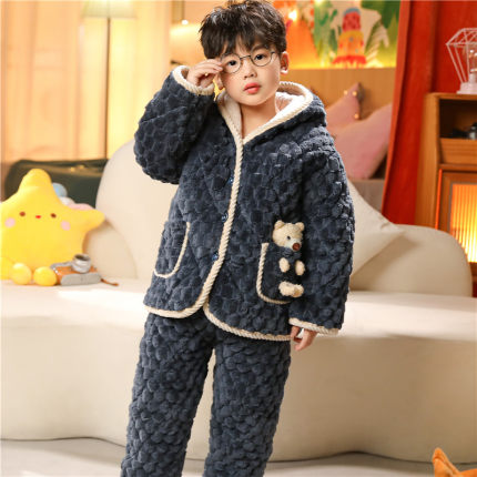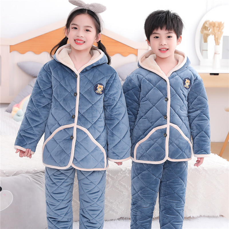 儿童法兰绒睡衣冬季三层夹棉加厚家居服套装男孩子女童珊瑚绒保暖