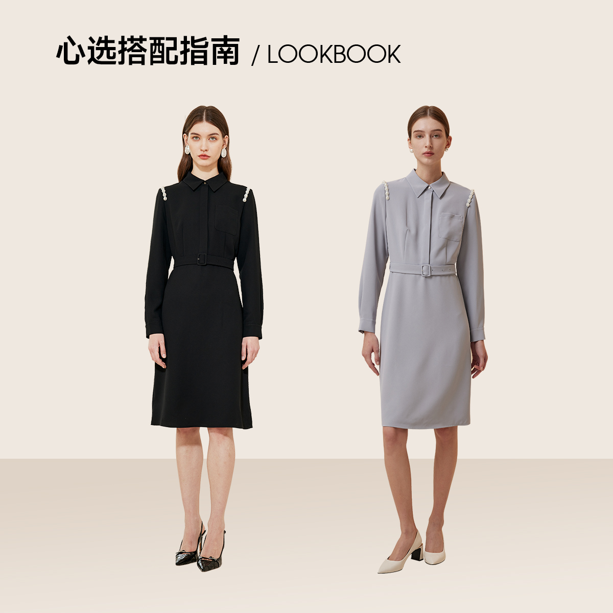 PRICH洋气法式摩登收腰珍珠装饰Polo领职业连衣裙女