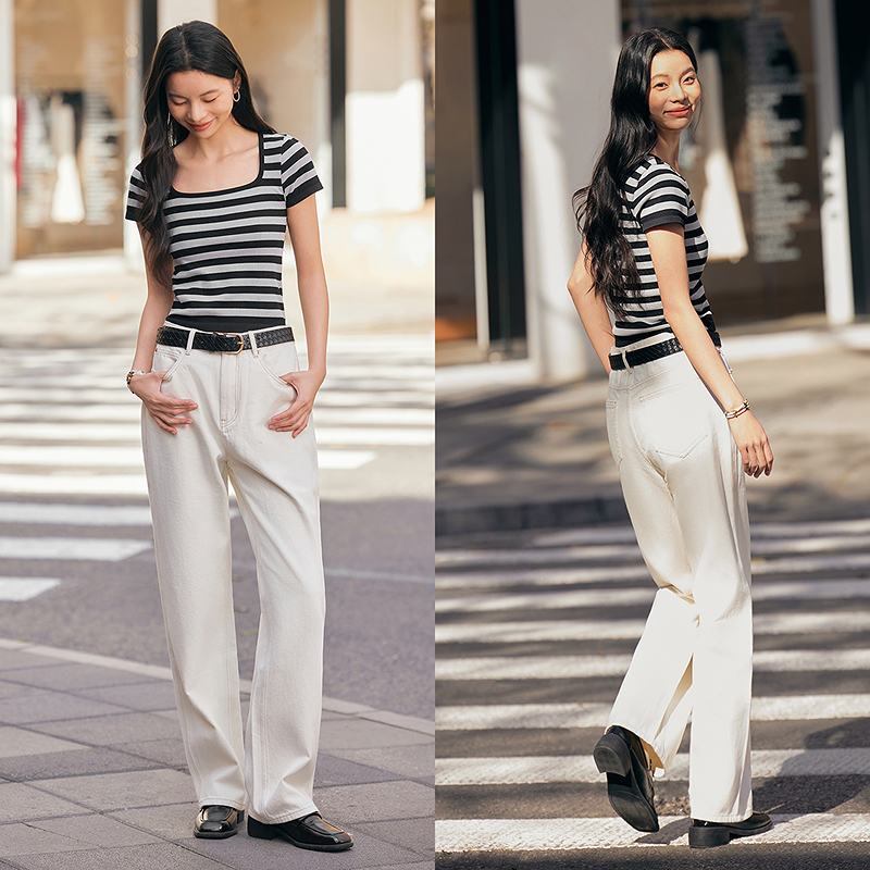 森马打底衫女款时髦复古条纹短袖T恤方圆领内搭春季上衣修身显瘦
