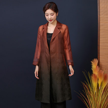 蝶恋春秋提花渐变生丝缎中长款宽松外套国风真丝长袖崔万志风衣女