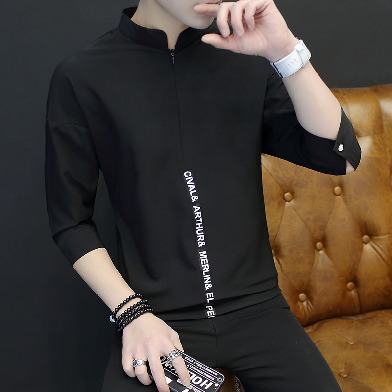 春夏季薄款中袖T恤男士修身白色拉链打底衫韩版七分袖立领短袖潮